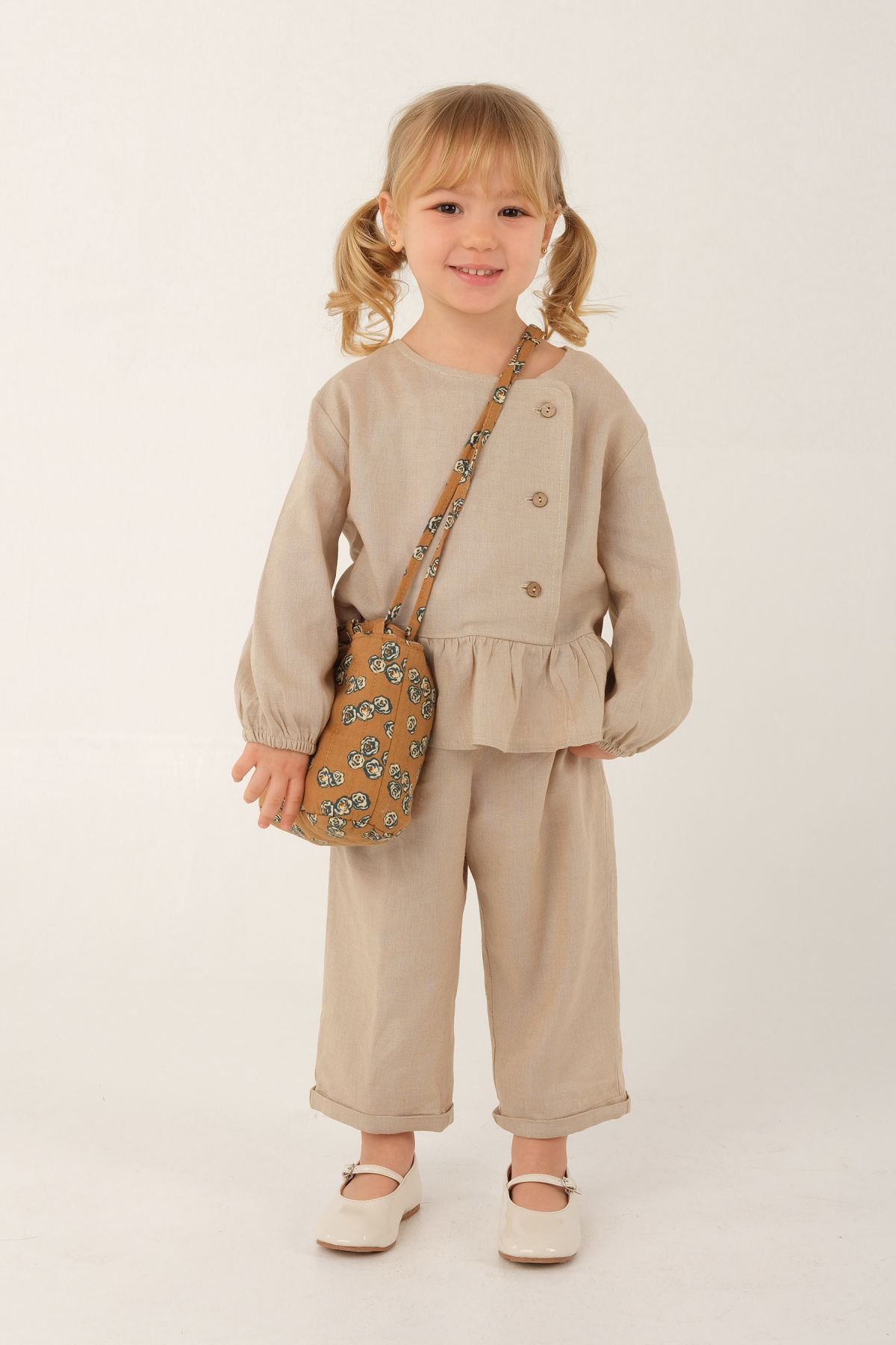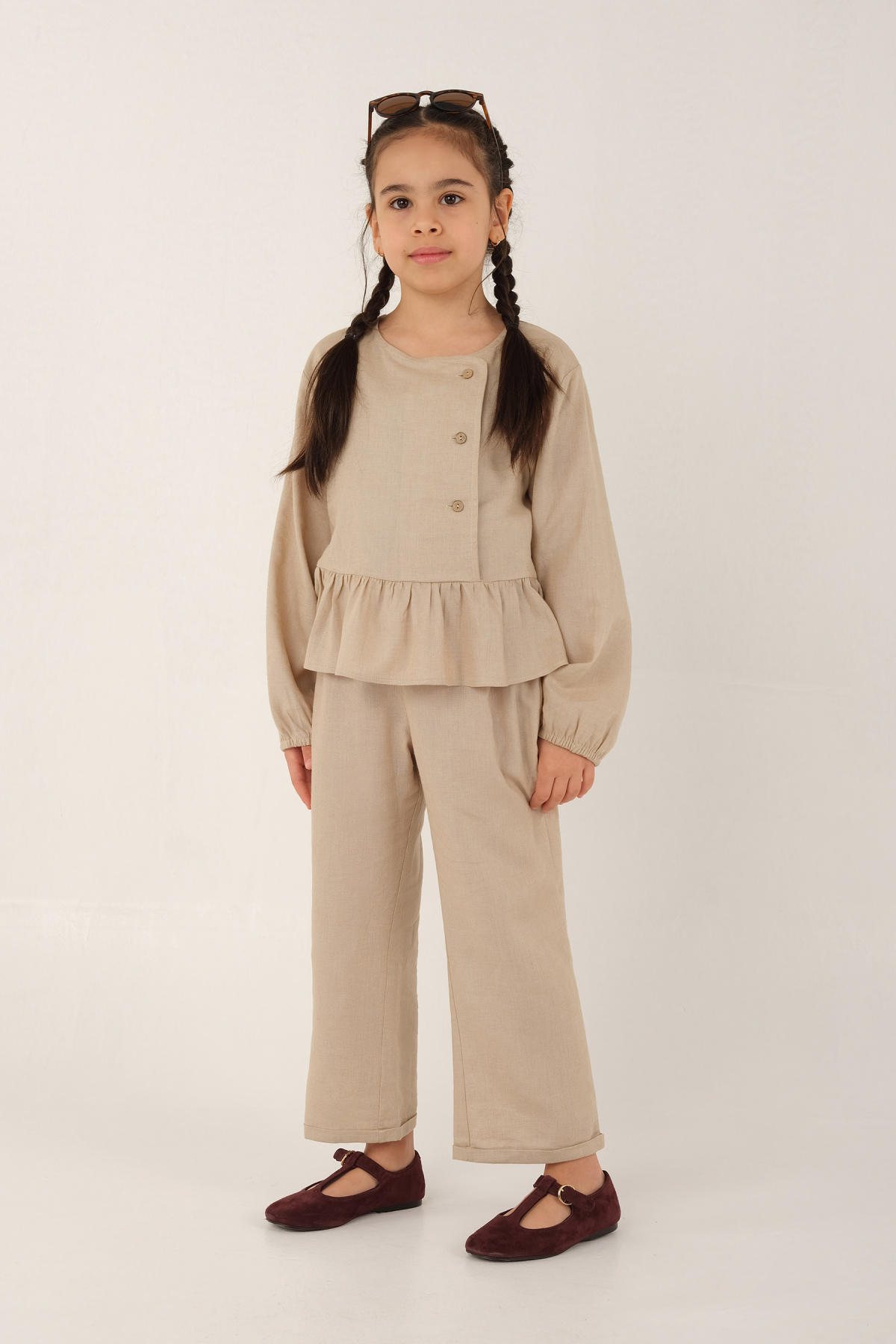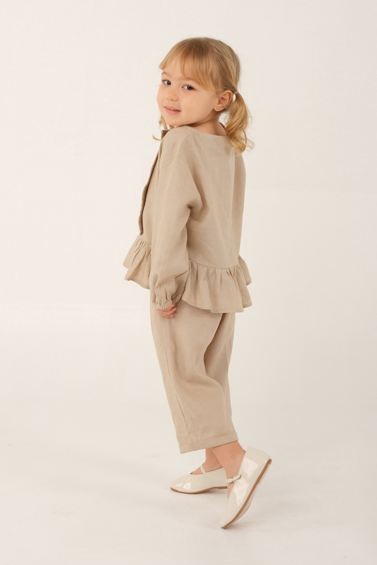 Discover the perfect blend of comfort and style with our Beige Linen Set made from 100% natural linen fabric. This adorable outfit features a double-breasted shirt with ruffled hem details and matching trousers designed with an elasticated back waist for easy wear. With a buttoned front placket and stylish pleat details, this set is ideal for little ones who love to explore while looking effortlessly chic. Available in a range of sizes to ensure a perfect fit for every child, it’s the perfect addition to your little one’s wardrobe for any occasion.