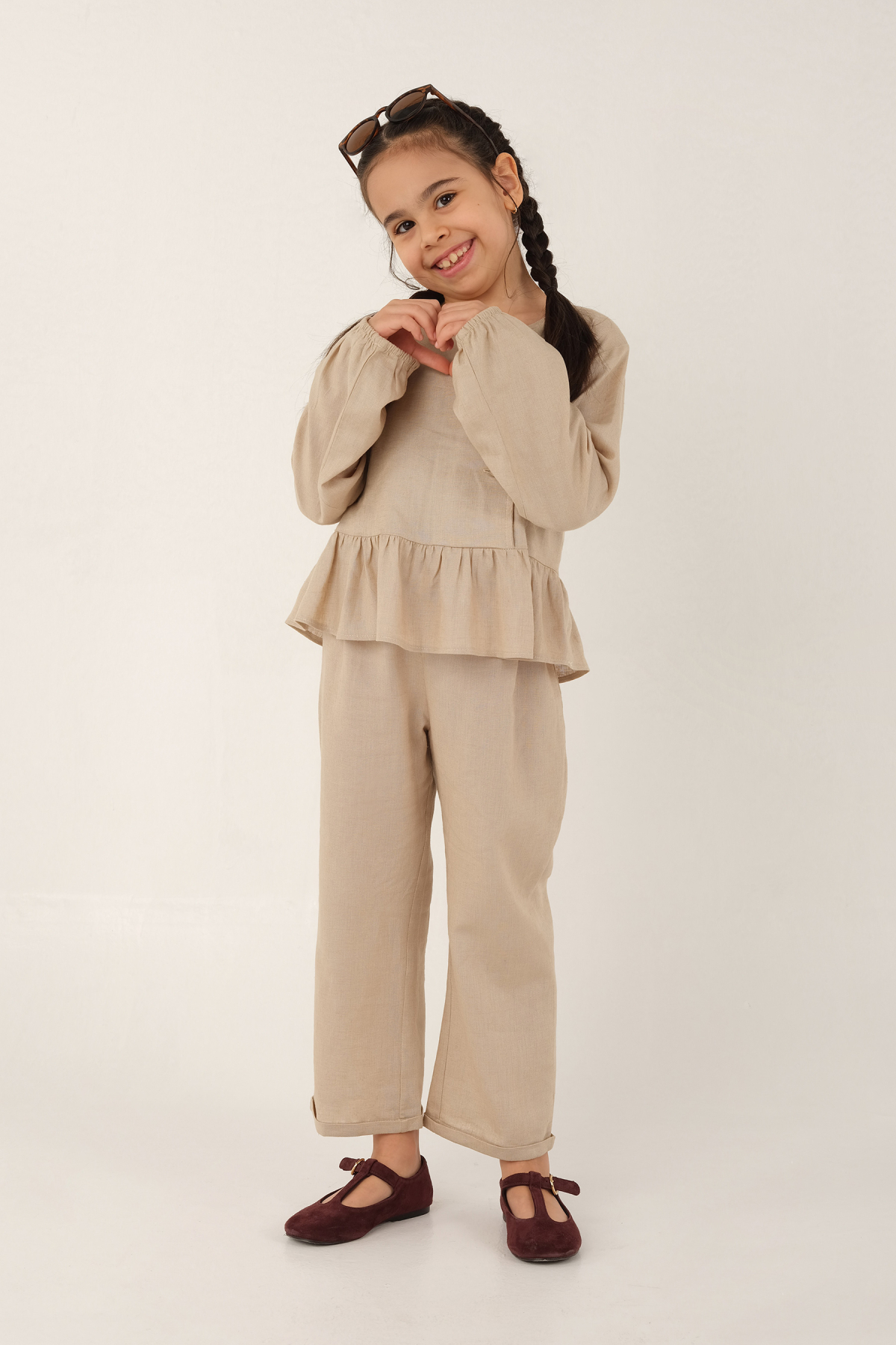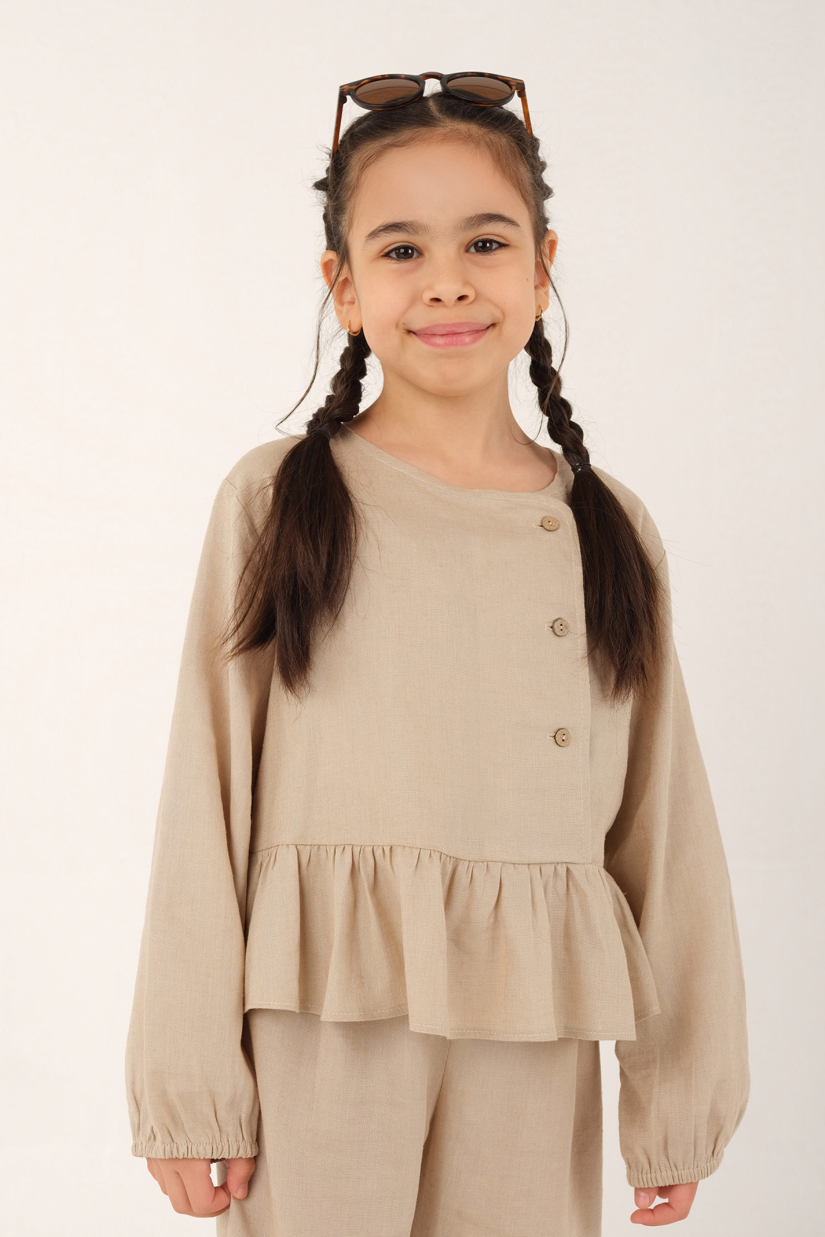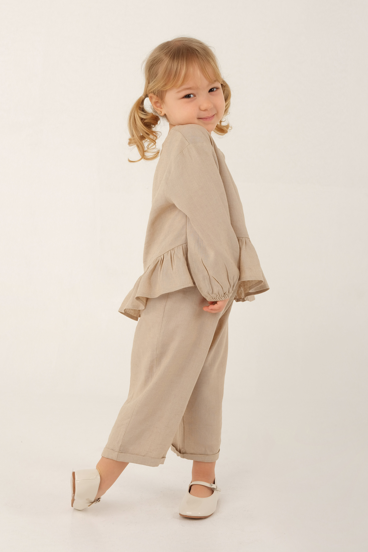 Discover the perfect blend of comfort and style with our Beige Linen Set made from 100% natural linen fabric. This adorable outfit features a double-breasted shirt with ruffled hem details and matching trousers designed with an elasticated back waist for easy wear. With a buttoned front placket and stylish pleat details, this set is ideal for little ones who love to explore while looking effortlessly chic. Available in a range of sizes to ensure a perfect fit for every child, it’s the perfect addition to your little one’s wardrobe for any occasion.