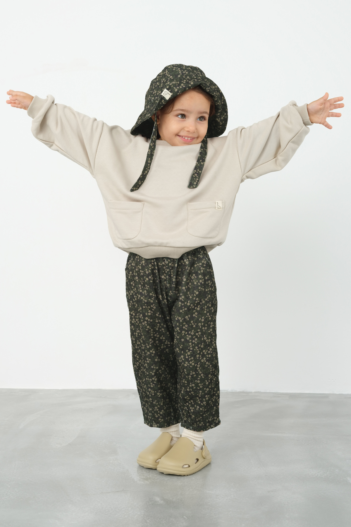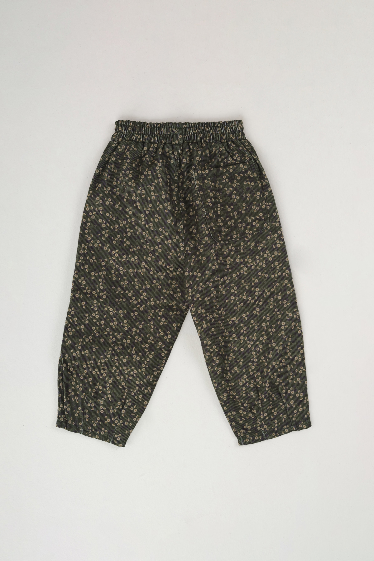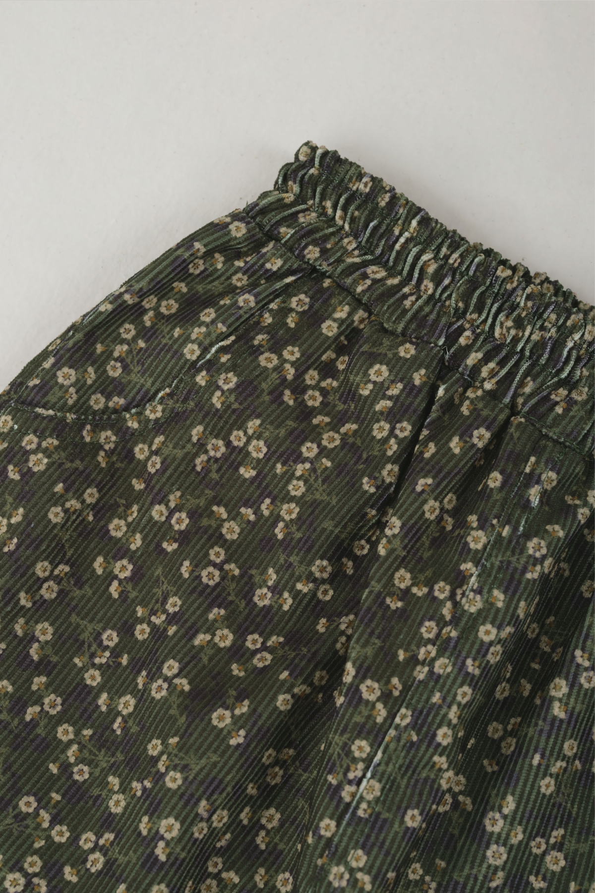 These charming floral green pants are crafted from soft corduroy fabric, featuring stylish pleated cuffs for added flair. With two convenient side pockets and one back pocket, they are perfect for little adventurers to carry their treasures. The elastic waistband ensures a comfortable fit, making them ideal for playtime and everyday wear. Your child will love the vibrant design and cozy feel of these delightful pants!