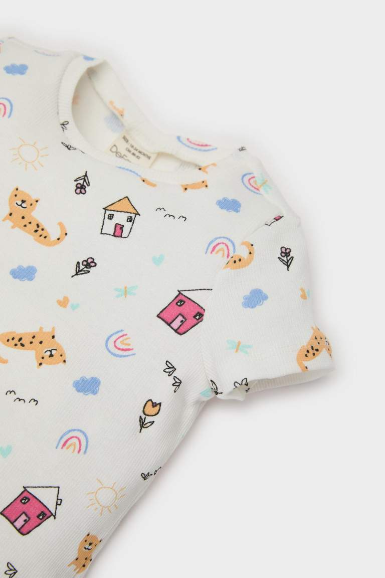Girls' Baby Pajama Set with Patterned Short Sleeve Ribbed Top and Elasticated Long Pants