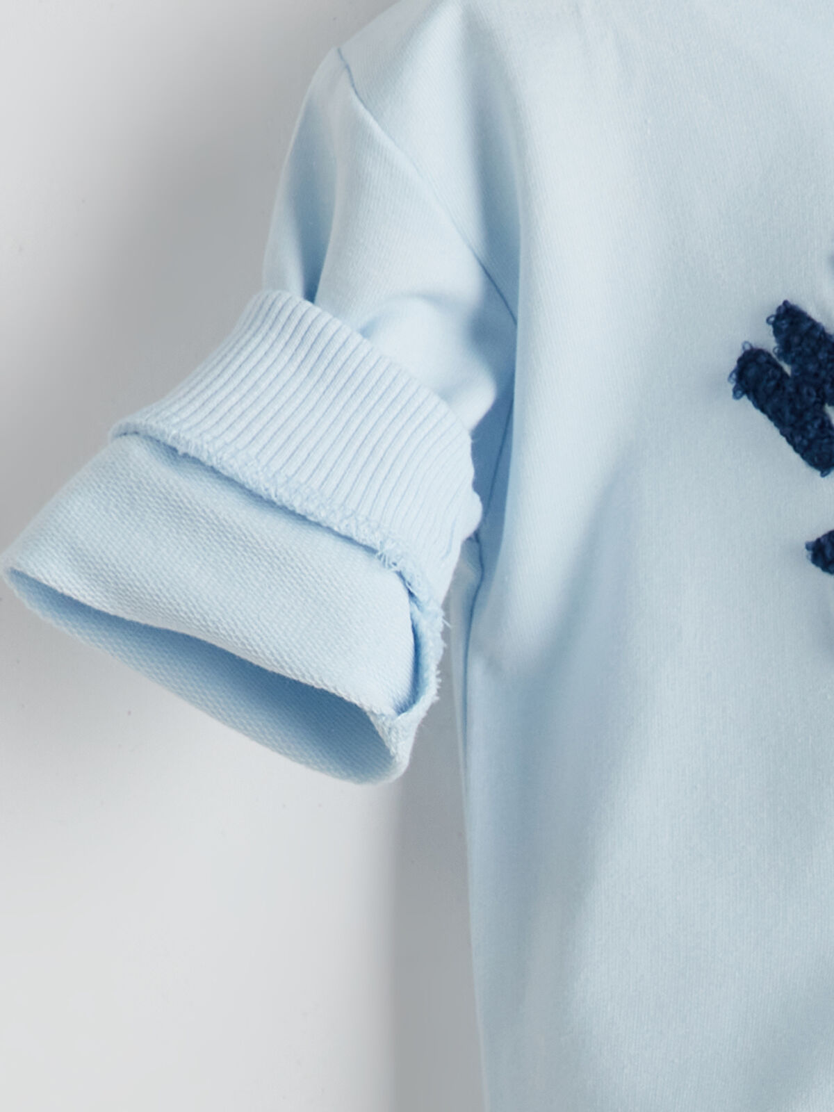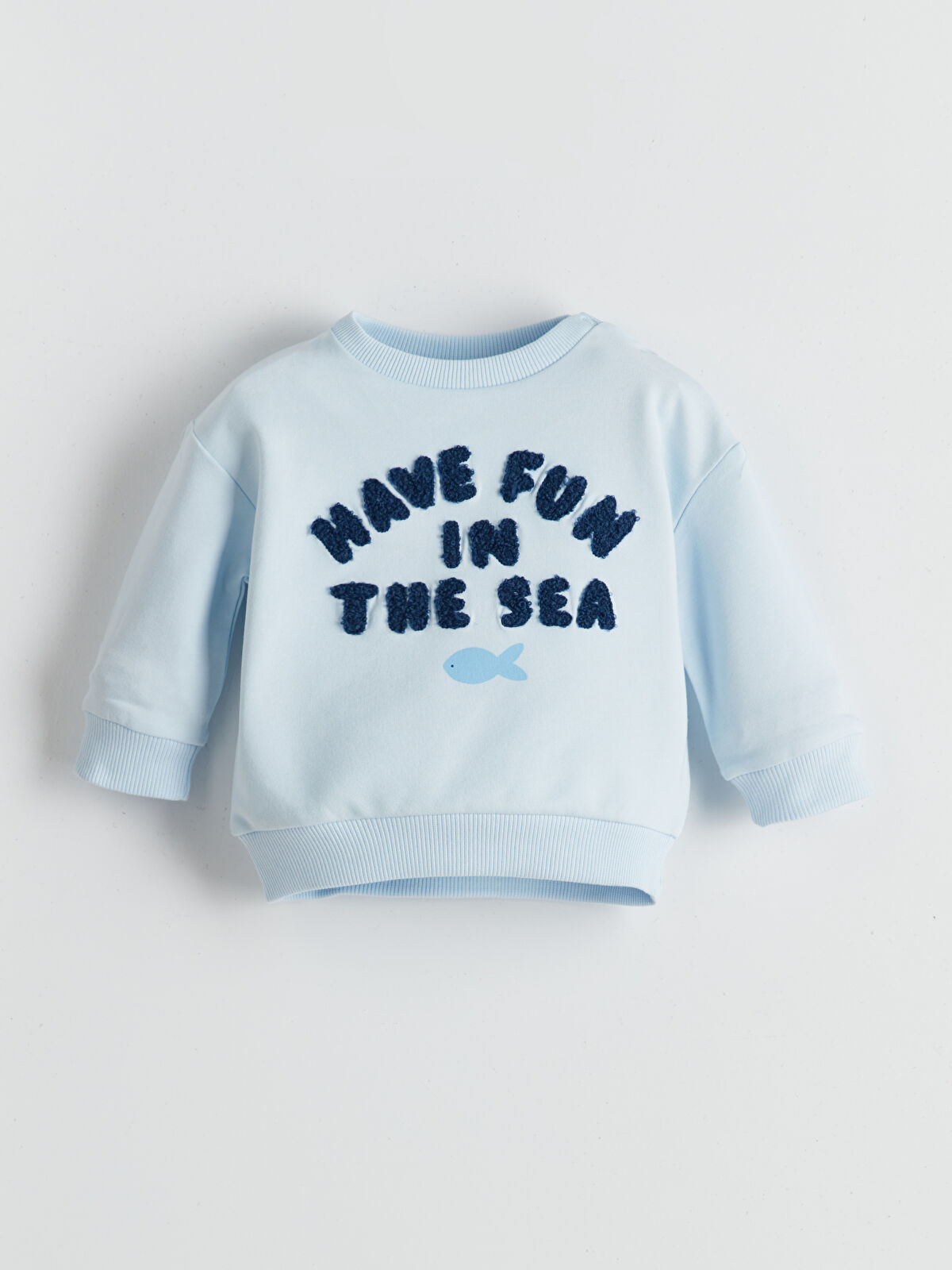Dress your little one in comfort and style with this adorable blue crew neck sweatshirt for baby boys. Featuring a textured slogan and playful fish print on the front, this long-sleeved piece is perfect for keeping your child cozy during cooler days. The ribbed cuffs and hem add a classic touch, making it a versatile addition to any wardrobe. Crafted from a soft cotton blend, this sweatshirt ensures your baby stays comfortable while looking cute all day long.