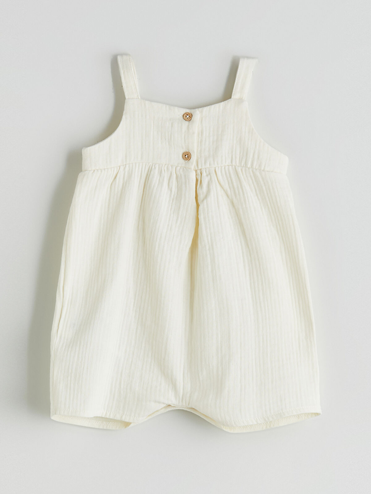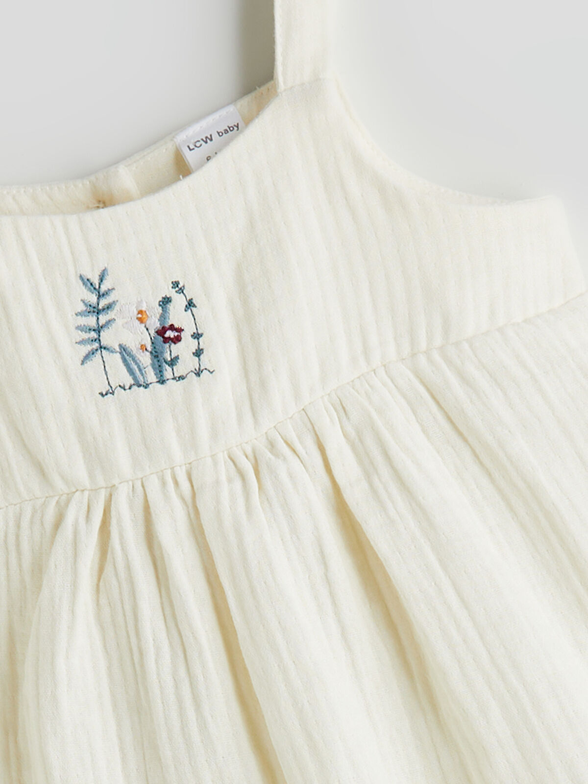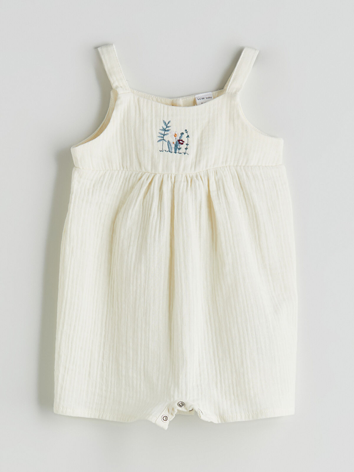 Dress your little one in this adorable cream romper, crafted from high-quality muslin fabric for ultimate comfort. Featuring a charming square neckline and thick straps, this romper is beautifully adorned with delicate embroidery on the chest. Designed for baby girls, it combines style with practicality, ensuring easy dressing with its snap closure. Perfect for playdates or cozy days at home, this romper is a delightful addition to your baby’s wardrobe, making every moment special.