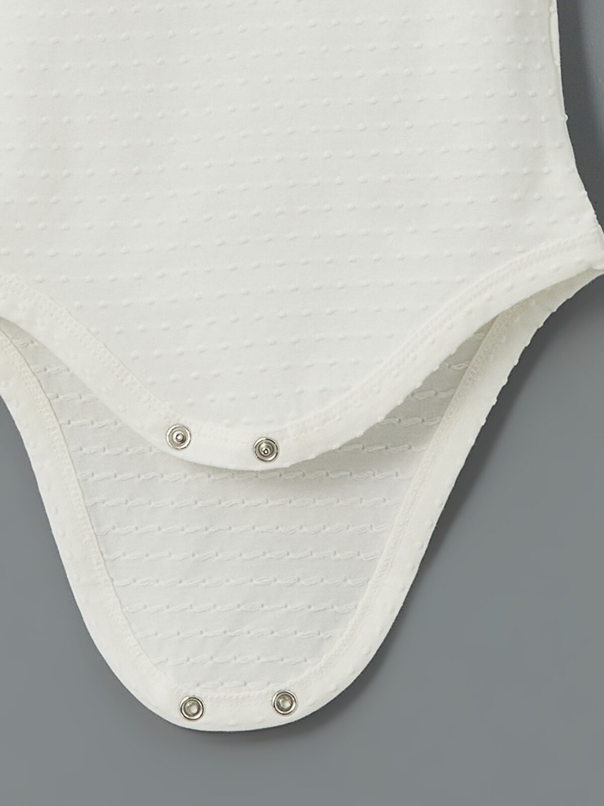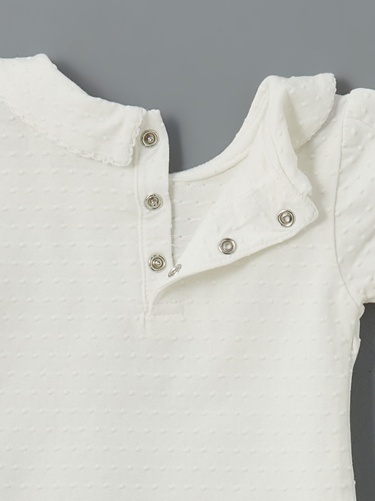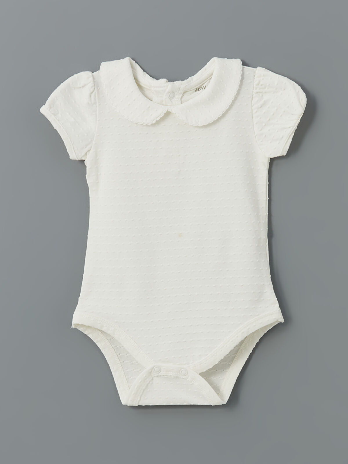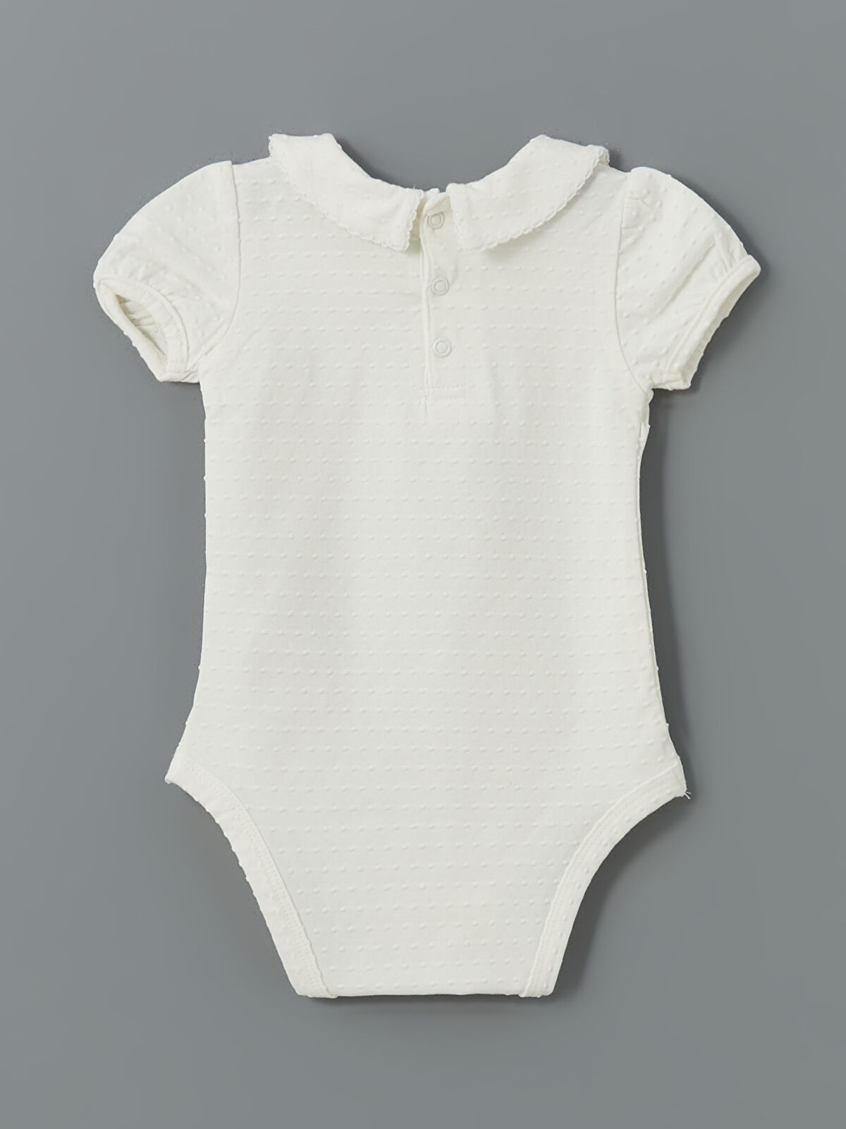 Dress your little one in cozy style with this charming cream bodysuit featuring a delightful Peter Pan collar and short puffed sleeves. Crafted from a soft cotton blend, this high-quality piece is designed for comfort and ease, making diaper changes a breeze with its convenient snap closures. The subtle textured polka dot design adds a playful touch, perfect for your baby girl’s wardrobe. Ideal for everyday wear or special occasions, this bodysuit combines sweetness and practicality for your precious newborn.
