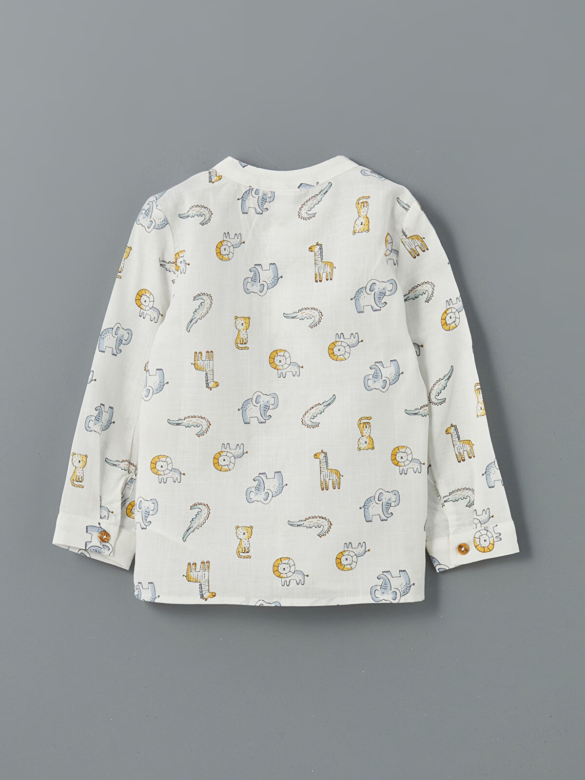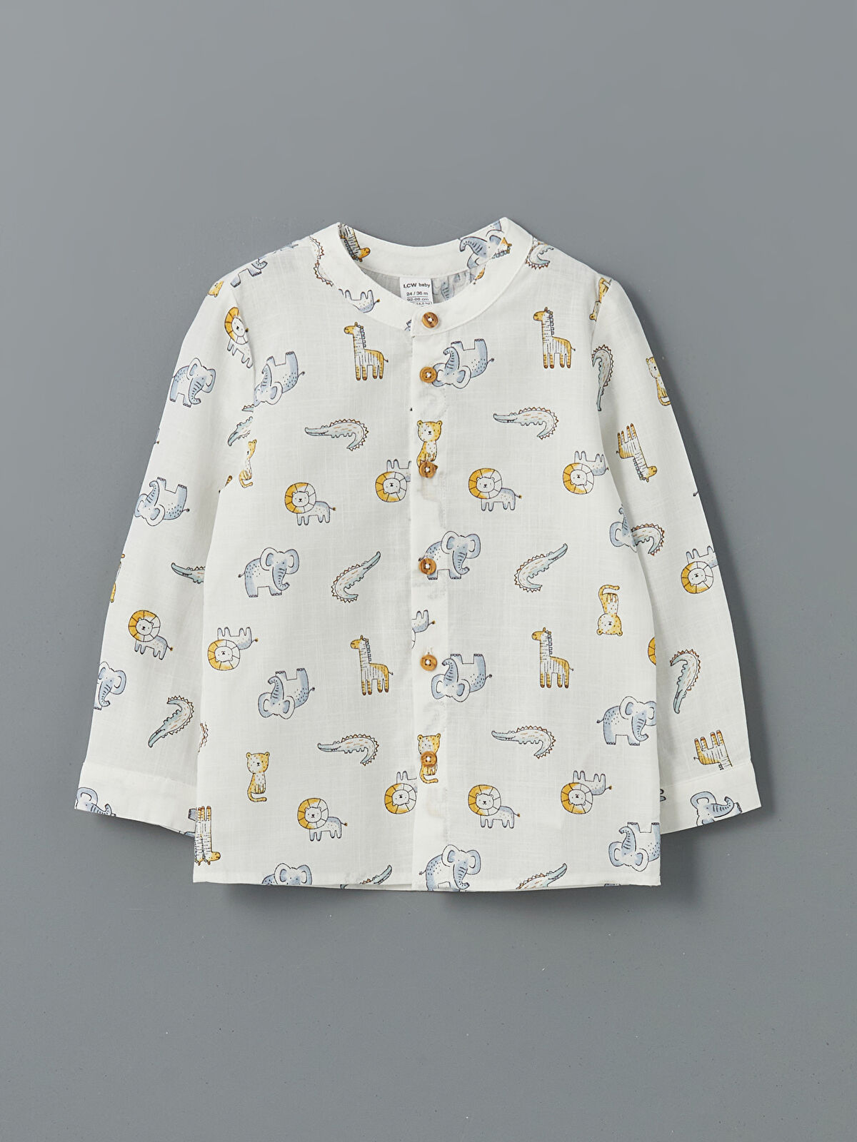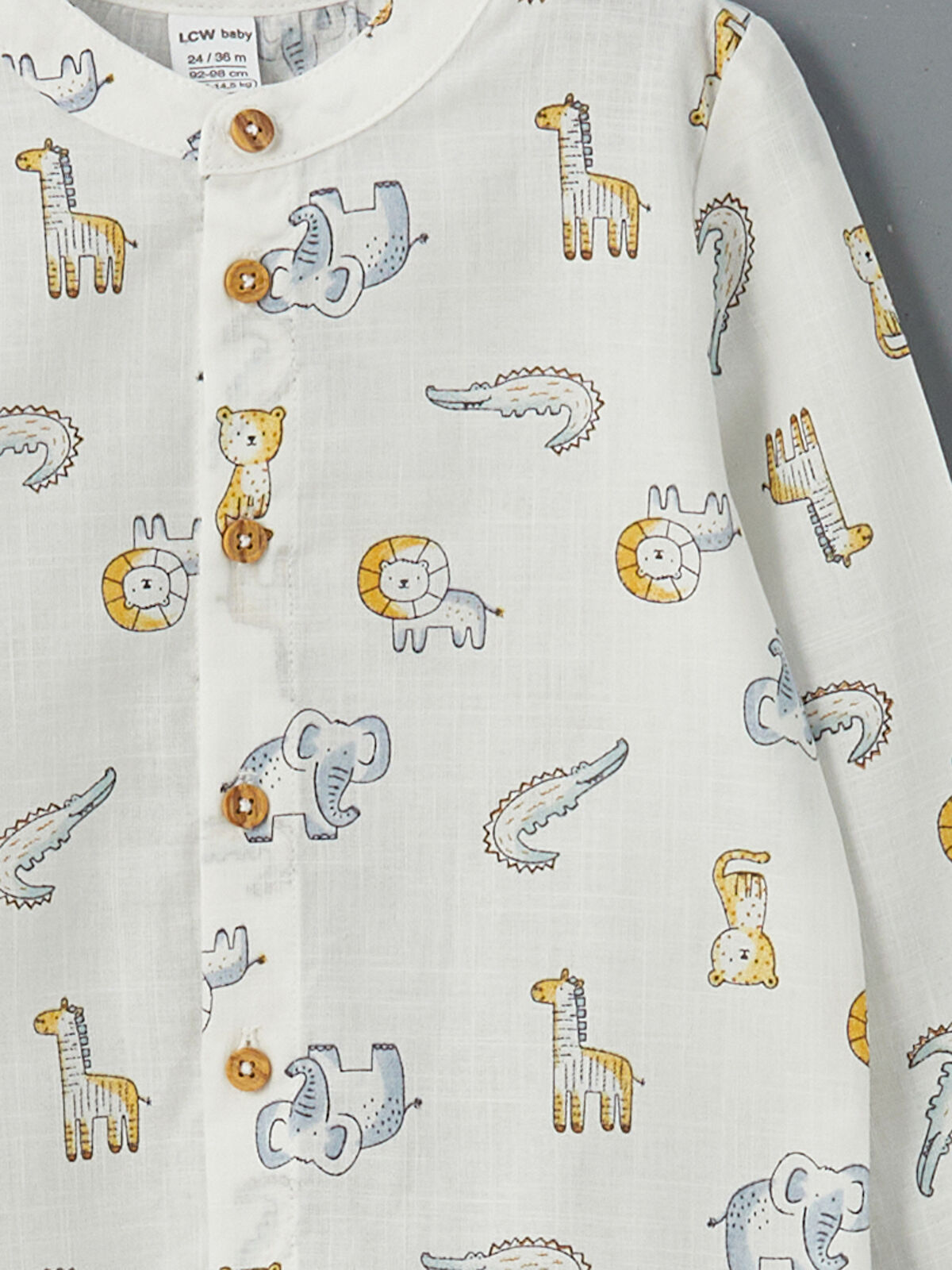 Dress your little one in style with this charming cream printed collar shirt, perfect for any occasion. Made from 100% cotton poplin, this long-sleeved shirt features a unique animal print design and a trendy collar that adds a touch of sophistication. The front button closure makes it easy to wear, ensuring your baby stays comfortable and fashionable all day long. Ideal for playdates or family gatherings, this shirt combines comfort and style for your little gentleman.