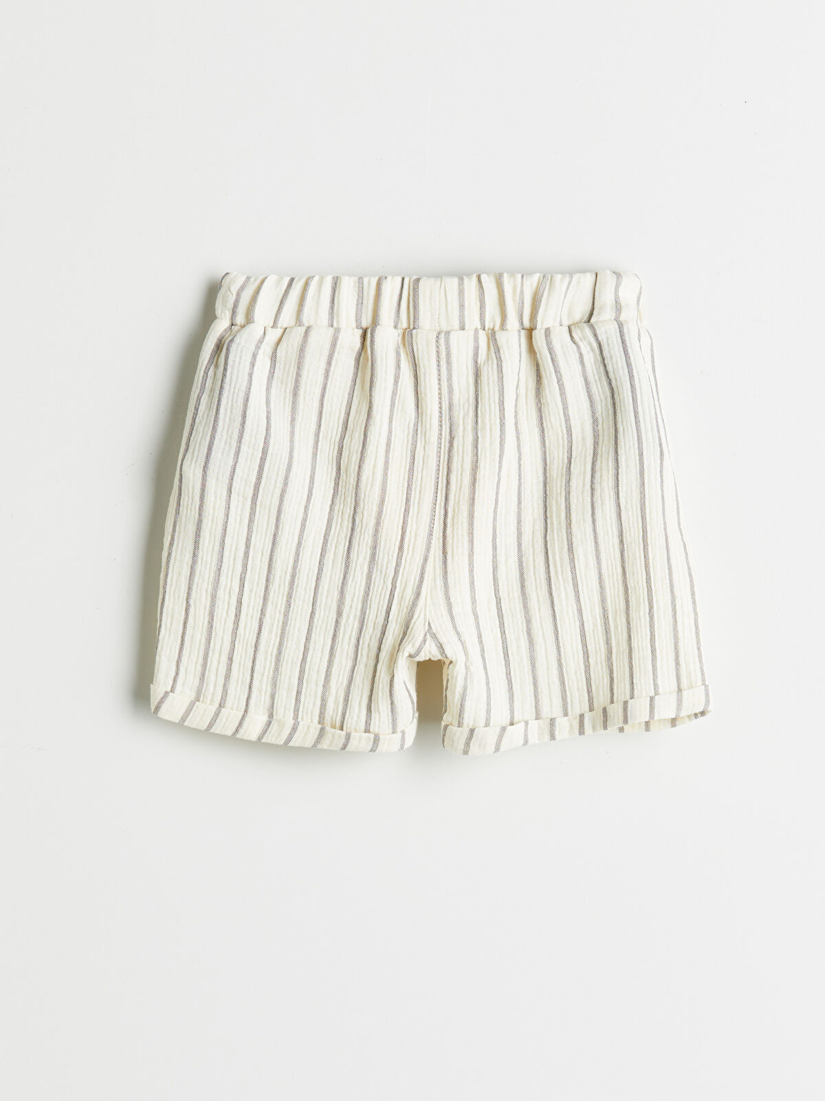 Dress your little one in comfort and style with these cream striped shorts, crafted from high-quality muslin fabric with a soft cotton blend. Designed for baby boys, these shorts feature an elastic waistband with a drawstring for a secure fit and convenient side pockets for tiny treasures. Perfect for warm days, they offer a playful look that’s both fashionable and functional, making them an essential addition to your baby’s wardrobe.