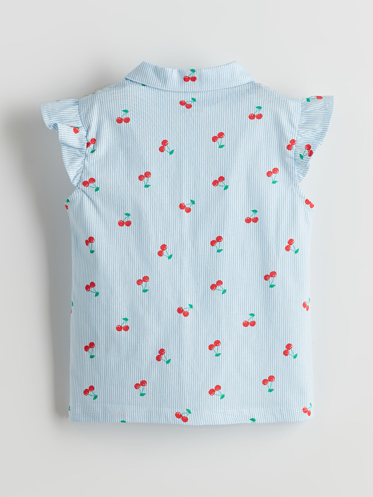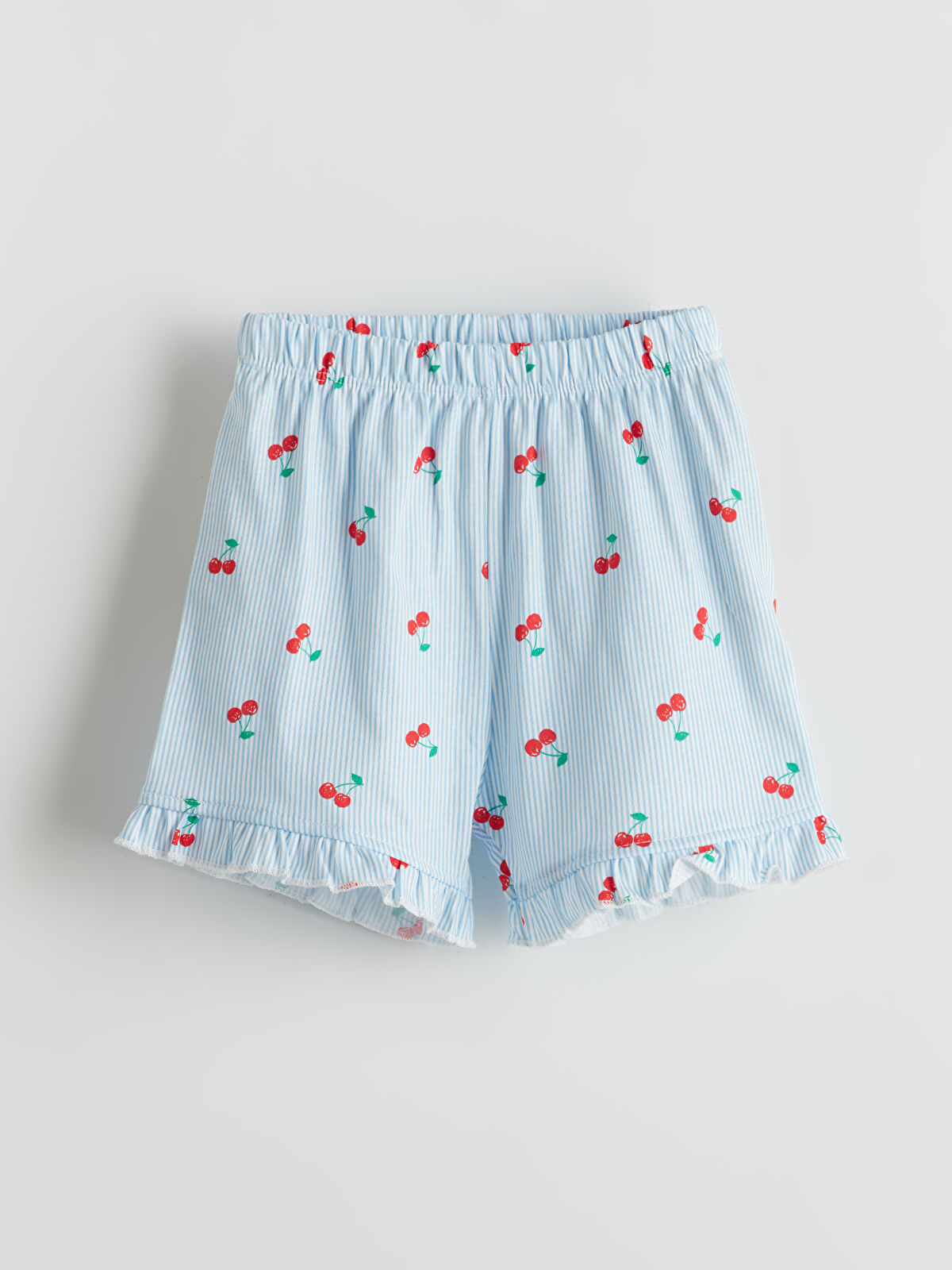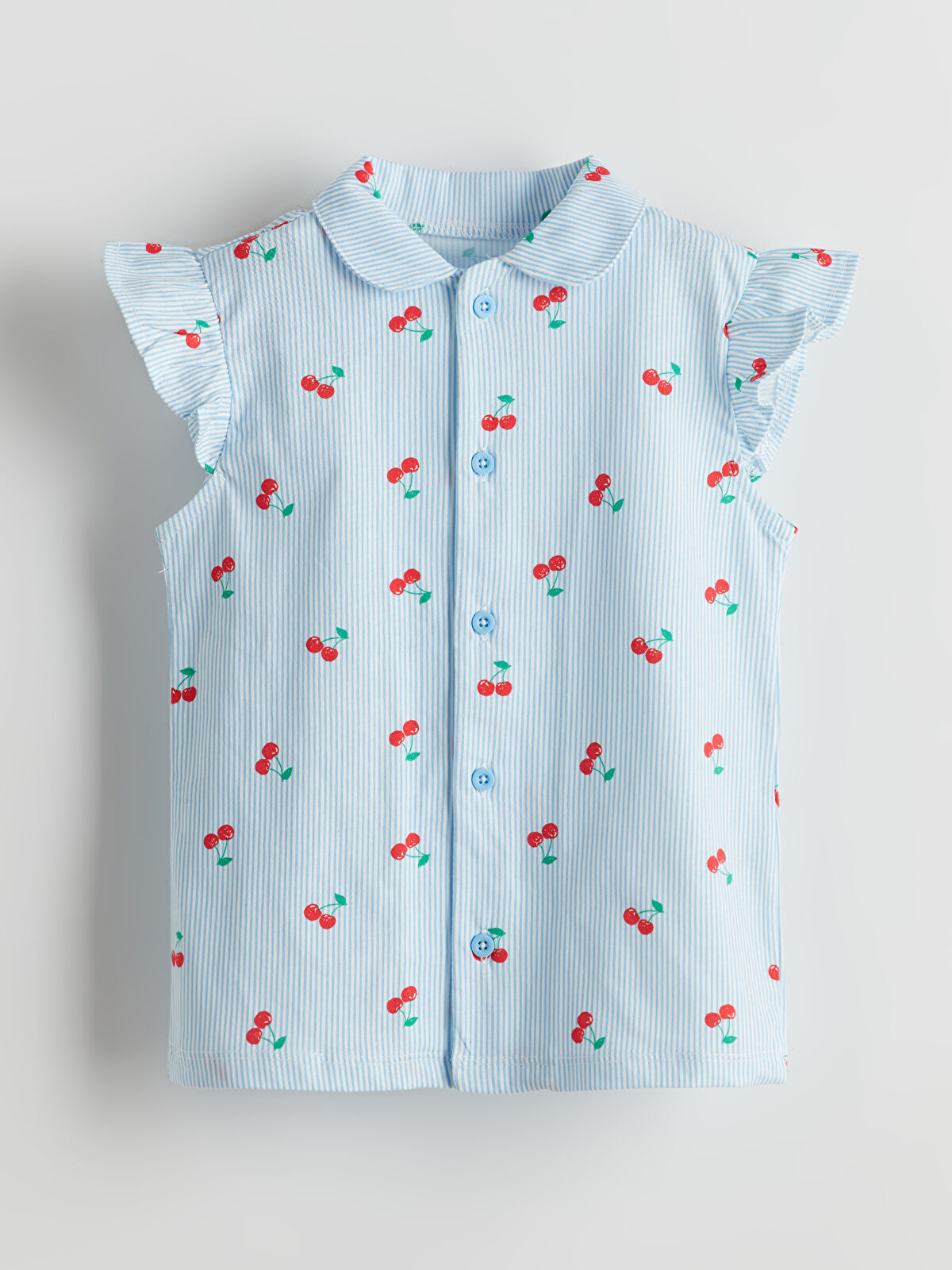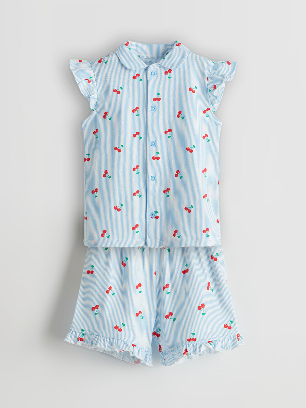 This adorable girl’s pajama set is perfect for your little one, featuring a charming ecru top with a playful cherry print, a sweet ruffled collar, and short sleeves. The easy button-up front adds convenience, while the matching shorts come with an elastic waistband and delightful ruffled hems for extra comfort. Made from 100% cotton, this lightweight and breathable outfit ensures your baby stays cozy and stylish during bedtime or playtime. A must-have addition to your child’s sleepwear collection!
