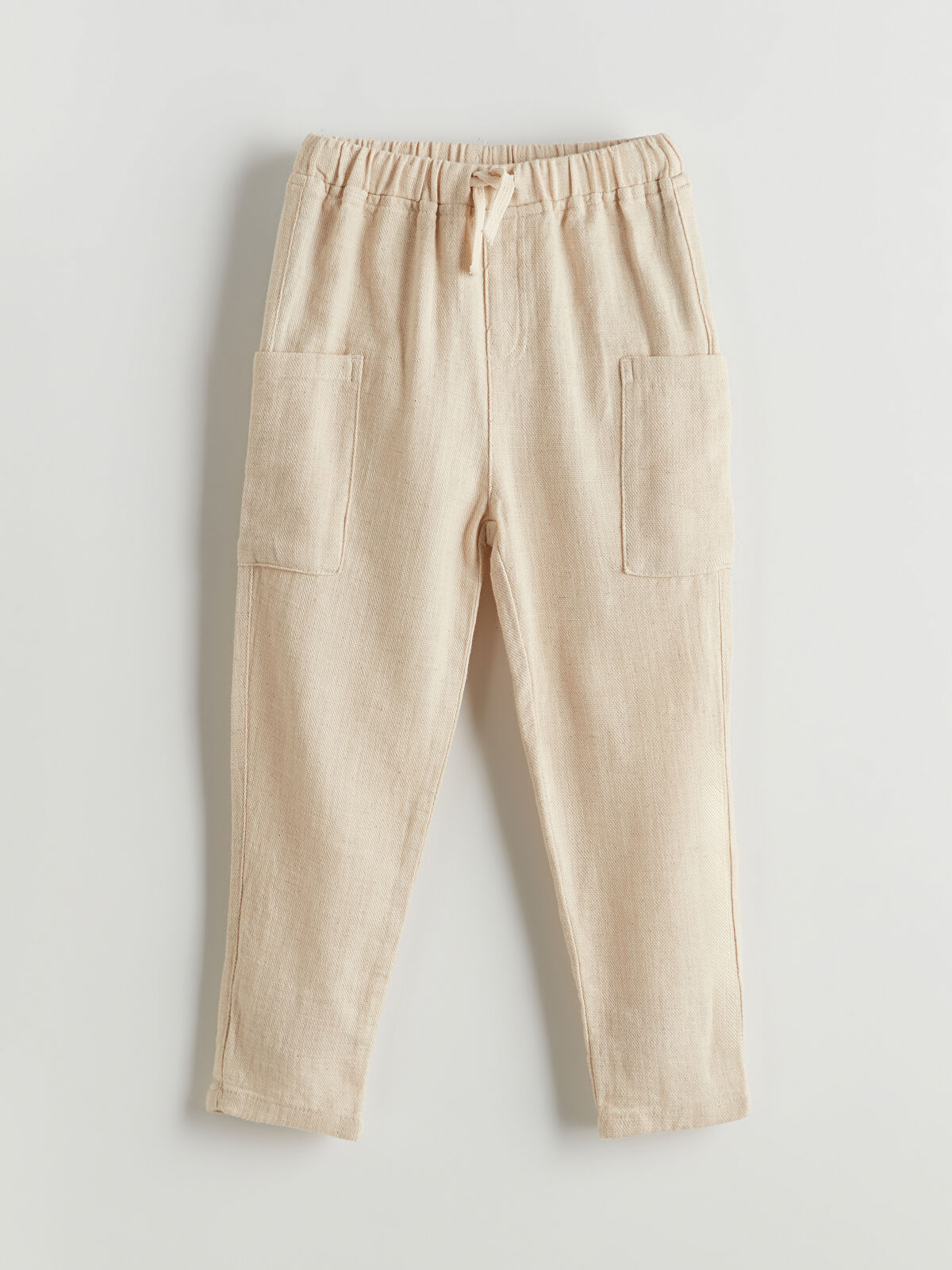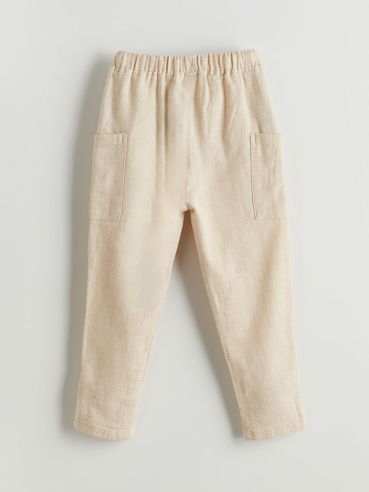 These stylish beige linen pants for boys are designed with comfort in mind, featuring a loose fit and straight legs. Made from a high cotton content linen blend, they are perfect for everyday wear. The elastic waistband and adjustable drawstrings ensure a great fit, while the convenient patch pockets add a playful touch. Ideal for active little ones, these pants are a versatile addition to any child’s wardrobe, perfect for both casual outings and special occasions.