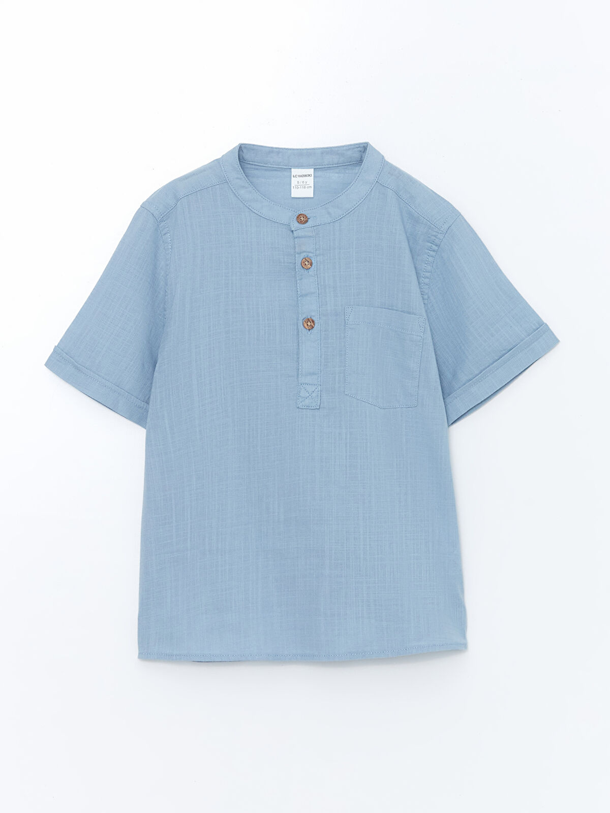 Dress your little one in style with this charming blue mandarin collar poplin shirt from LCW Kids. Crafted from 100% cotton, this short-sleeved shirt offers a comfortable fit for everyday wear. It features a half-button placket and a single chest pocket, making it both practical and stylish. Perfect for playdates or family outings, this shirt combines a classic design with modern comfort, ensuring your child looks great while feeling free to explore.