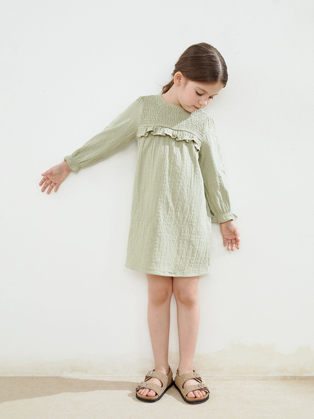 Dress your little one in style with this charming green muslin dress from LCW Kids. Crafted from a high cotton content, this long-sleeve dress features a delightful crew neck, gathered bodice, and beautiful ruffled details, making it perfect for any occasion. The soft and breathable fabric ensures comfort for all-day wear, while the exquisite embroidery adds a touch of elegance. Ideal for playful days out or family gatherings, this dress is a must-have for every young girl’s wardrobe.