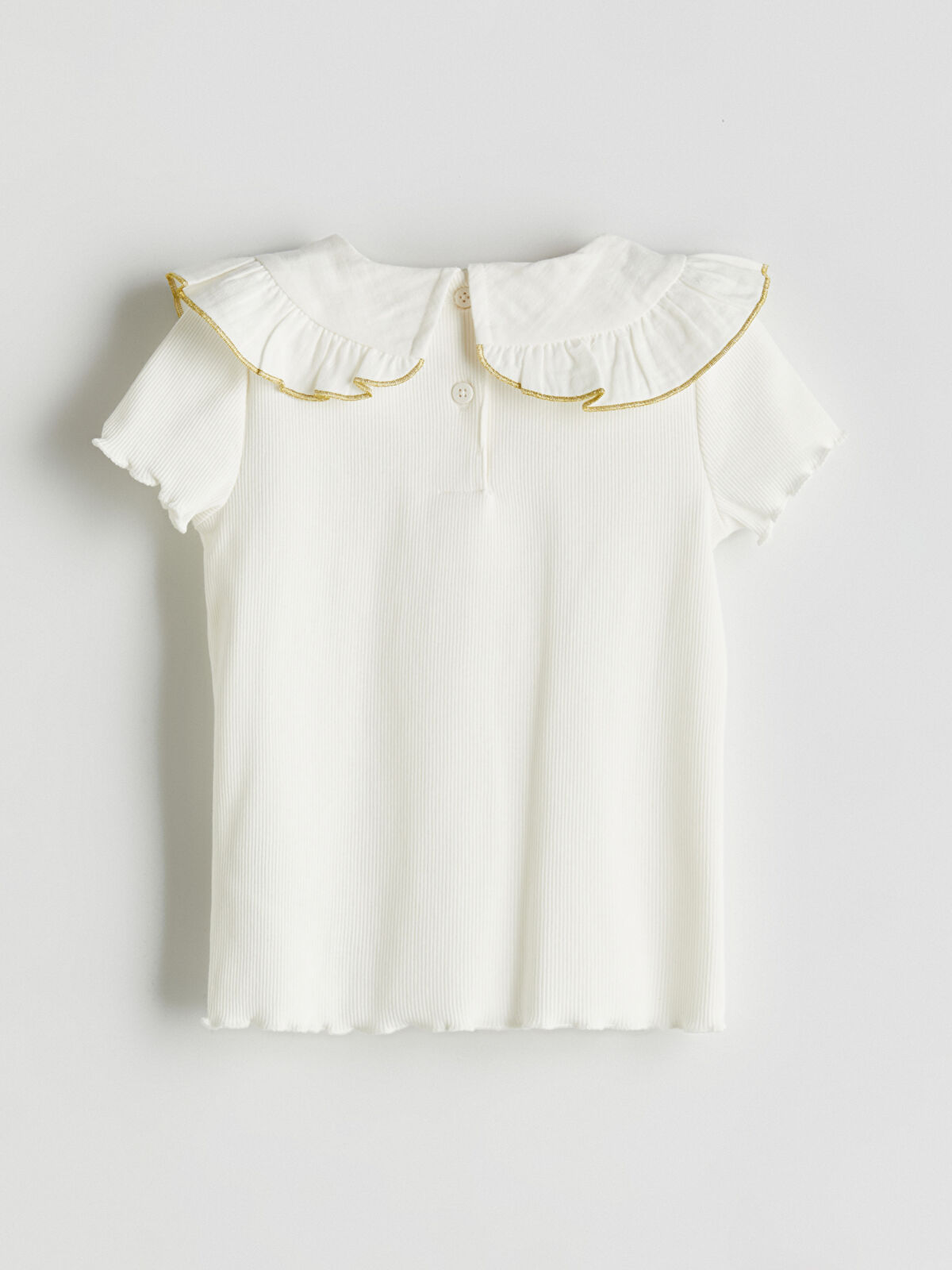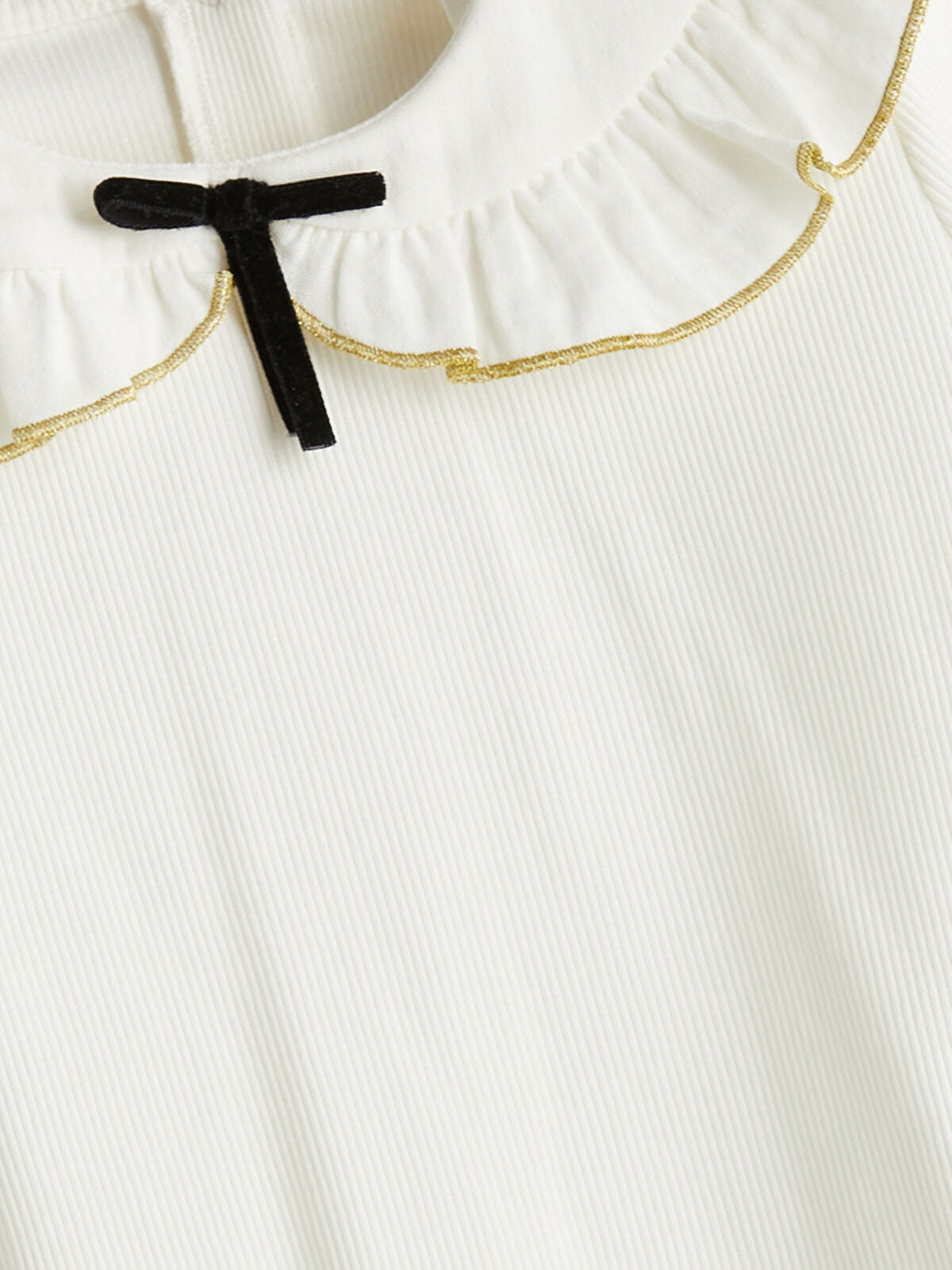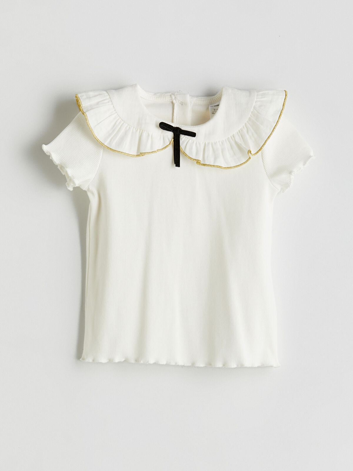 This charming ivory ribbed T-shirt for girls features a delightful bow detail and a frilly baby collar, perfect for adding a touch of whimsy to any outfit. Made from a high cotton content fabric, it offers a comfortable fit with short sleeves and a convenient button closure at the back. Ideal for special occasions or everyday wear, this stylish top is a must-have addition to your child’s wardrobe.