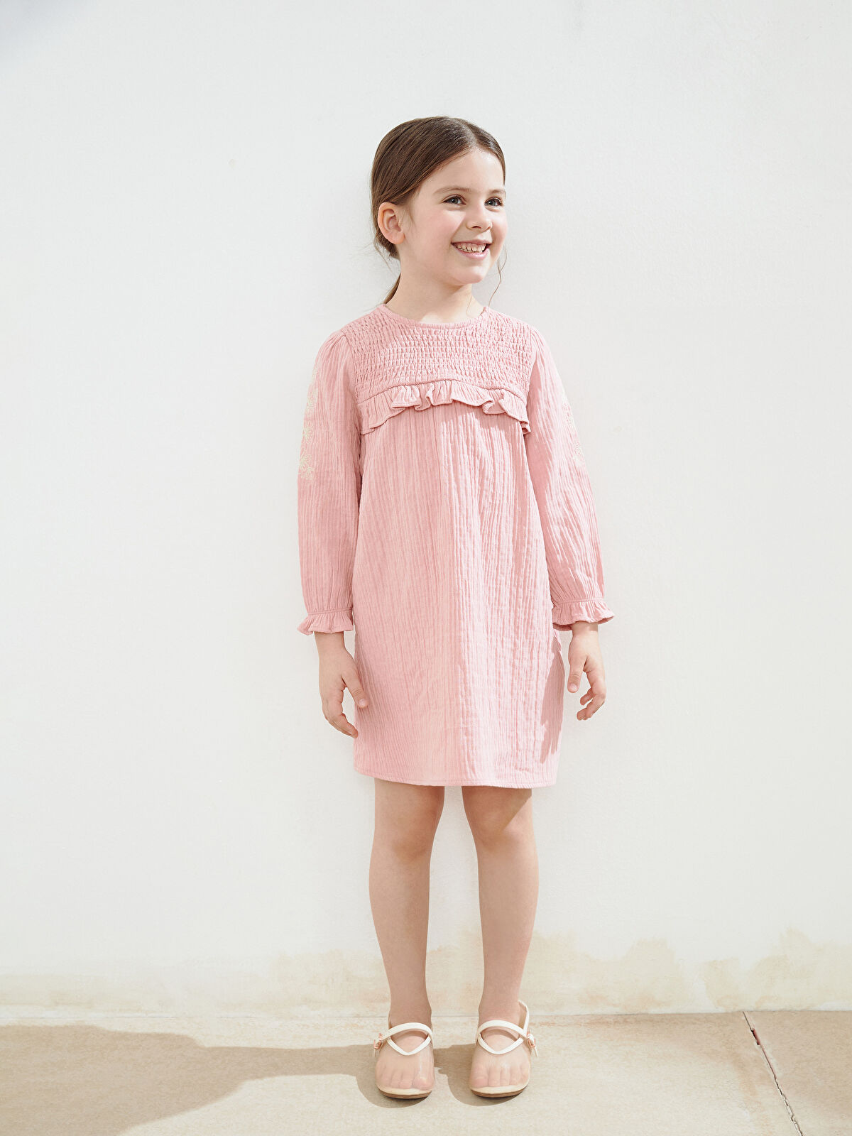 LCW Kids Pink Crew Neck Muslin Dress for Girls