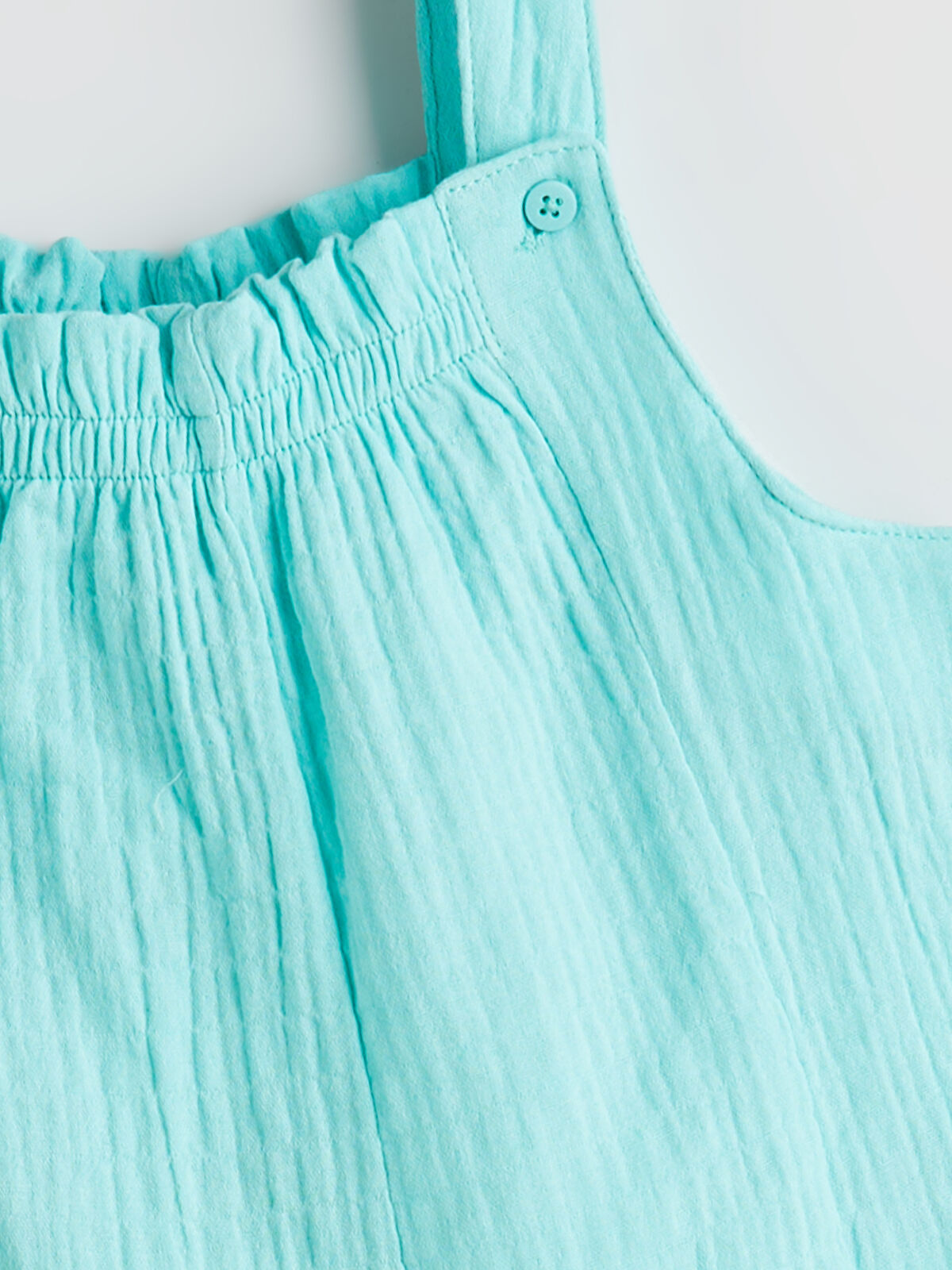 This charming girls’ overall is crafted from high-quality muslin fabric with a delightful cotton blend, ensuring comfort and breathability for your little one. Featuring a stylish square neckline and adjustable button straps, it offers a perfect fit for playful adventures. The gathered chest detail adds a touch of flair, making it a fantastic choice for any casual outing. Ideal for warm days, this overall combines style and practicality, making it a must-have addition to your child’s wardrobe.