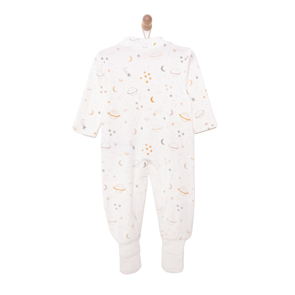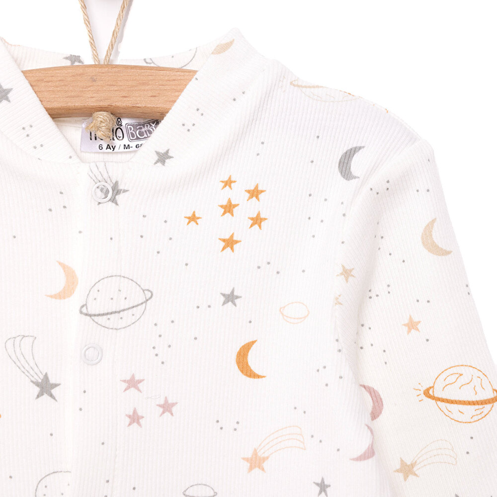 Dress your little astronaut in this adorable beige space-themed romper, featuring ribbed accents and built-in socks for extra warmth and comfort. Perfect for cozy adventures, this long-sleeve, crew-neck design offers both style and functionality, making it an essential addition to your baby’s wardrobe. Ideal for playtime or snuggling, this romper is sure to keep your newborn looking cute and feeling cozy.