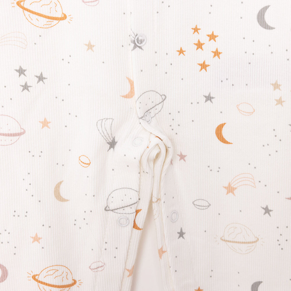 Newborn Boys' Beige Space-Themed Romper with Socks and Ribbed Details