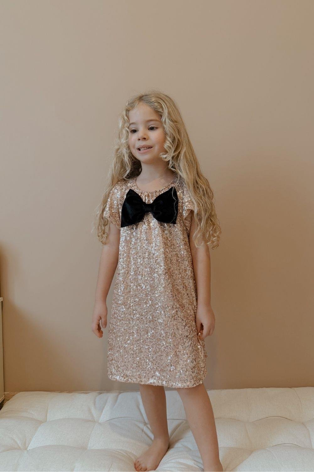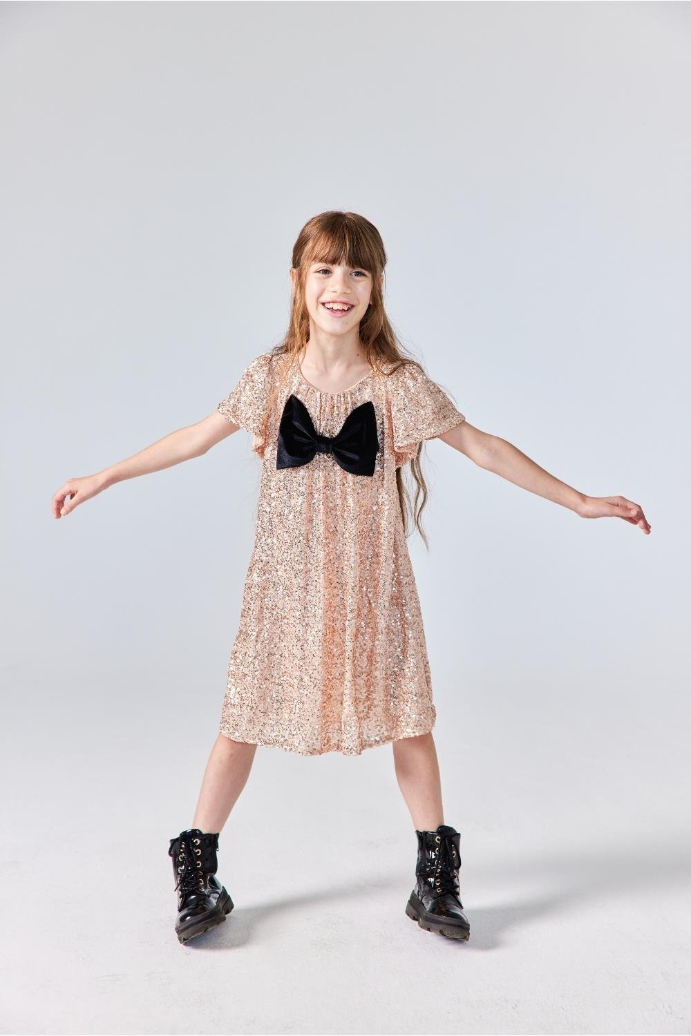Make every special occasion unforgettable with the Rhea Glitter Bow Detail Girl’s Dress. Crafted from 100% polyester sequin tulle, this stunning dress sparkles beautifully, adding a touch of elegance to any event. The soft inner lining ensures comfort for your little one, preventing direct contact with the skin. The striking black velvet bow detail provides a charming contrast, making this dress a perfect choice for stylish young girls who love to shine.