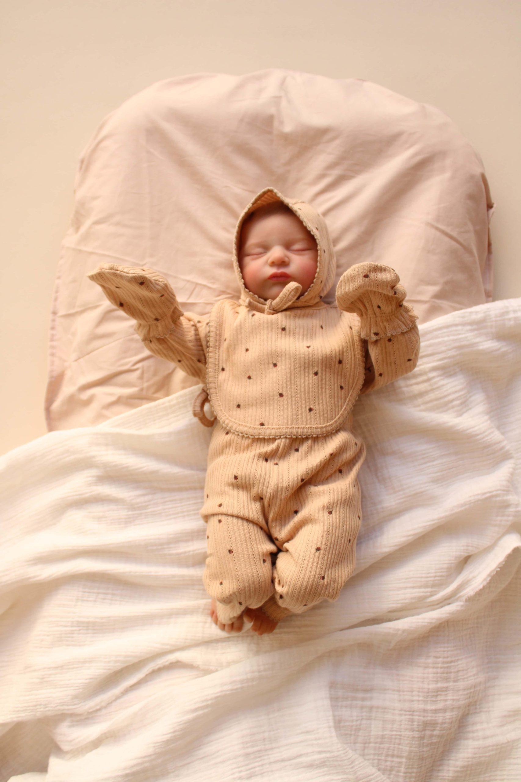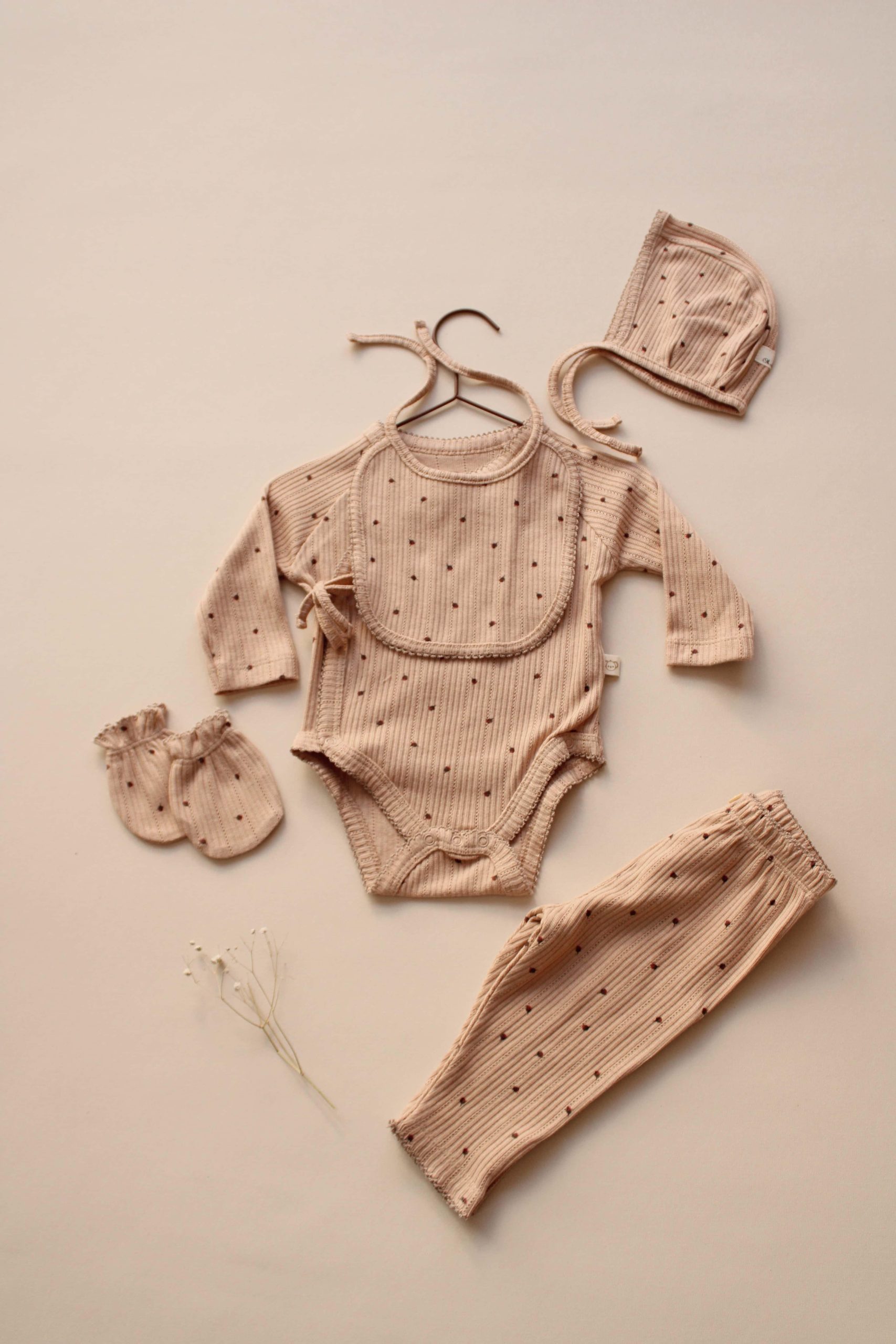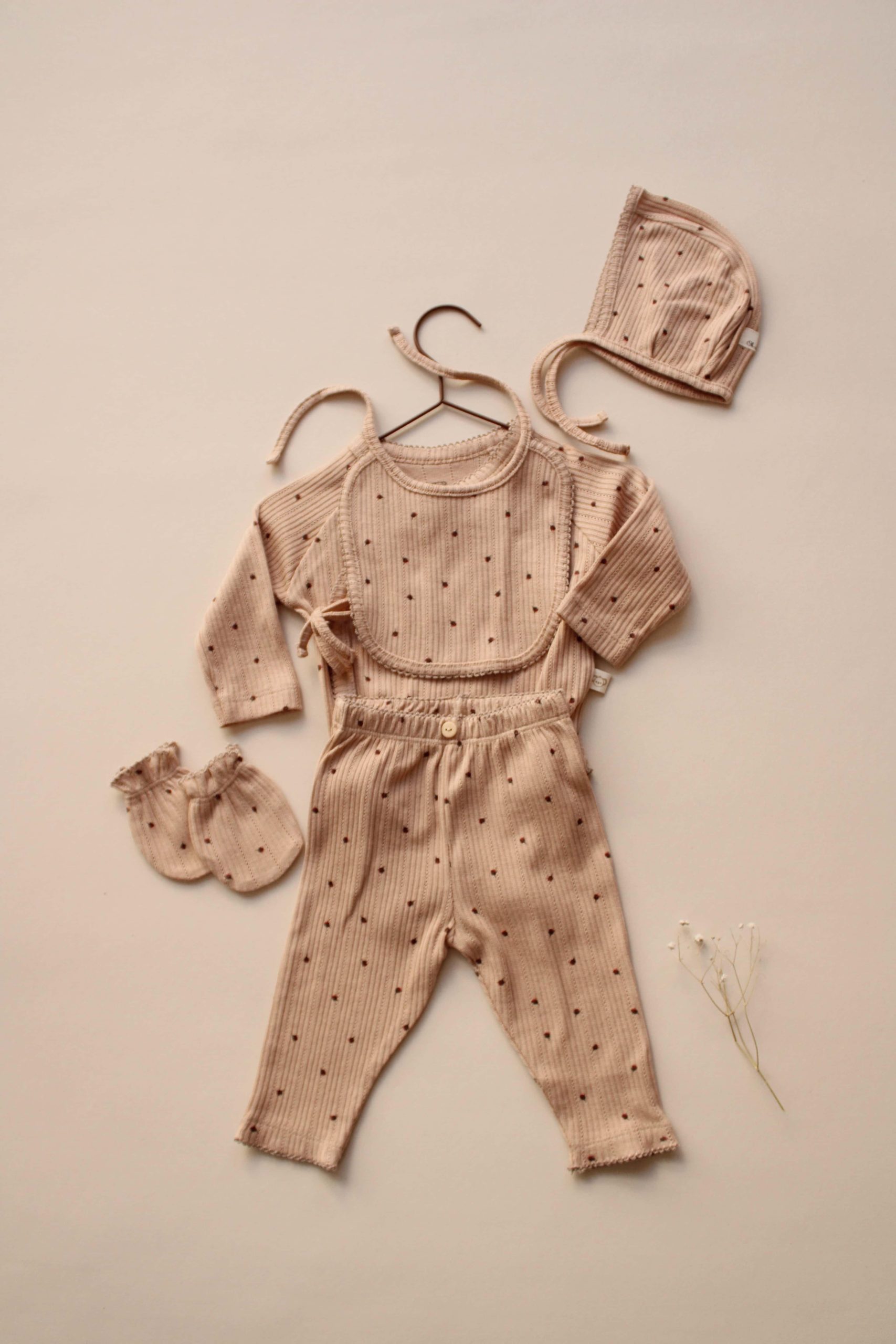 This adorable 5-piece newborn set includes a crossover snap bodysuit, a matching hat, cozy leggings, a bib, and soft gloves, all crafted from 100% cotton for ultimate comfort. Designed with a perfect fit in mind, this set features charming floral embroidery that adds a touch of sweetness to your little one’s wardrobe. Made to meet OEKO-TEX® standards, it ensures safety and quality for your baby. Ideal for gifting or everyday wear, this set is a must-have for every new parent.