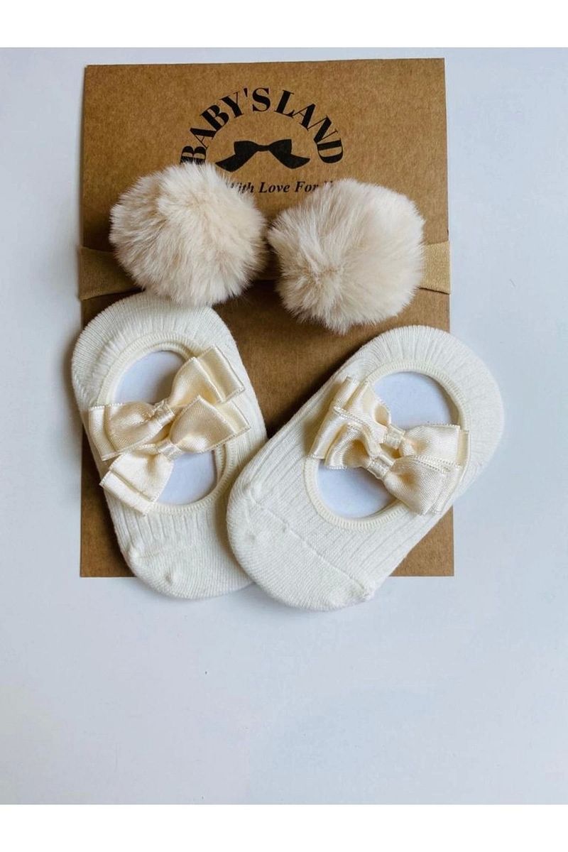 Babyland School Socks for Girls with Cream Pom-Pom Headband and Cream Ballet Socks