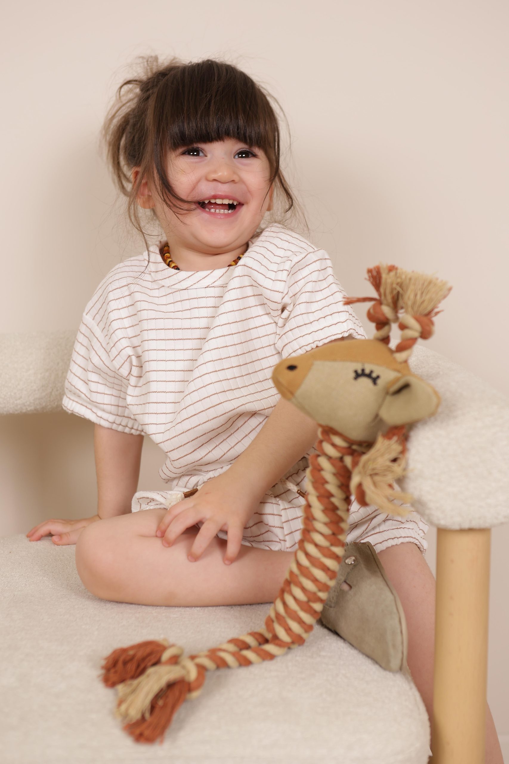 This brown striped elastic t-shirt and shorts set combines comfort and style, making it ideal for everyday wear. With a regular waist design for a comfortable fit and adjustable drawstring detail for personalized comfort, this set is a timeless addition to any child’s wardrobe. Crafted from sustainable materials, it offers freedom of movement while maintaining a chic look. The soft cotton fabric is breathable and skin-friendly, ensuring all-day comfort, while the modern cropped cut and ruffled sleeve details enhance mobility. Perfect for both boys and girls, this unisex set is designed for easy mixing and matching, making it a minimalist choice for fashion-forward kids.