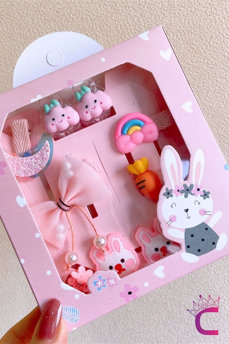Cinderella 10-Piece Special Design Gift Box Hair Clip Set – Rainbow Bunny Bow Hairpins