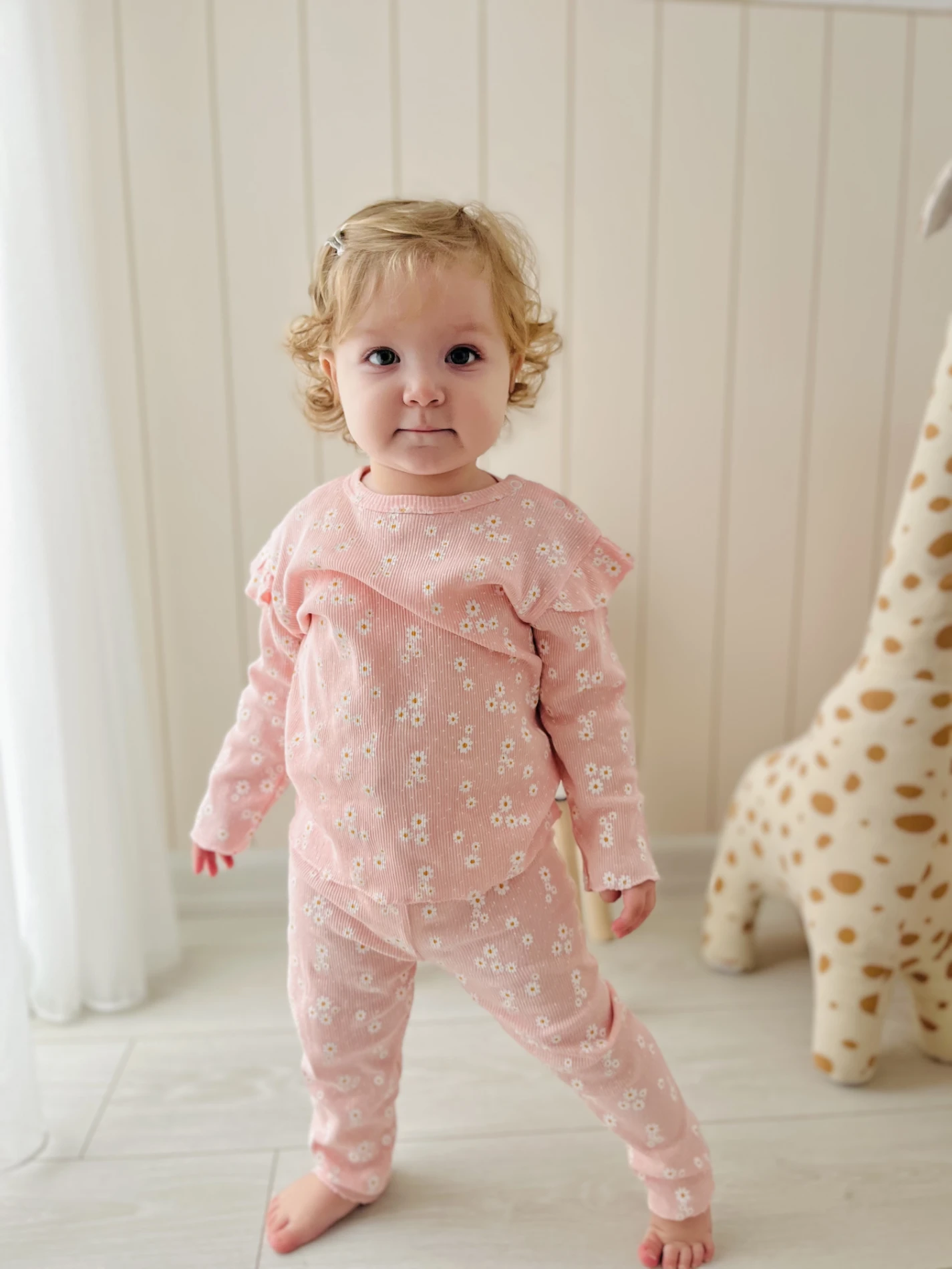 Dress your little one in this charming Daisy Print Ruffled Shoulder Top and Bottom Set, perfect for playful adventures and sunny days. Made from soft and flexible fabric, this outfit ensures all-day comfort while adding a touch of whimsy with its delightful floral design. The ruffled shoulders add a fun flair, making it an ideal choice for both casual outings and special occasions.