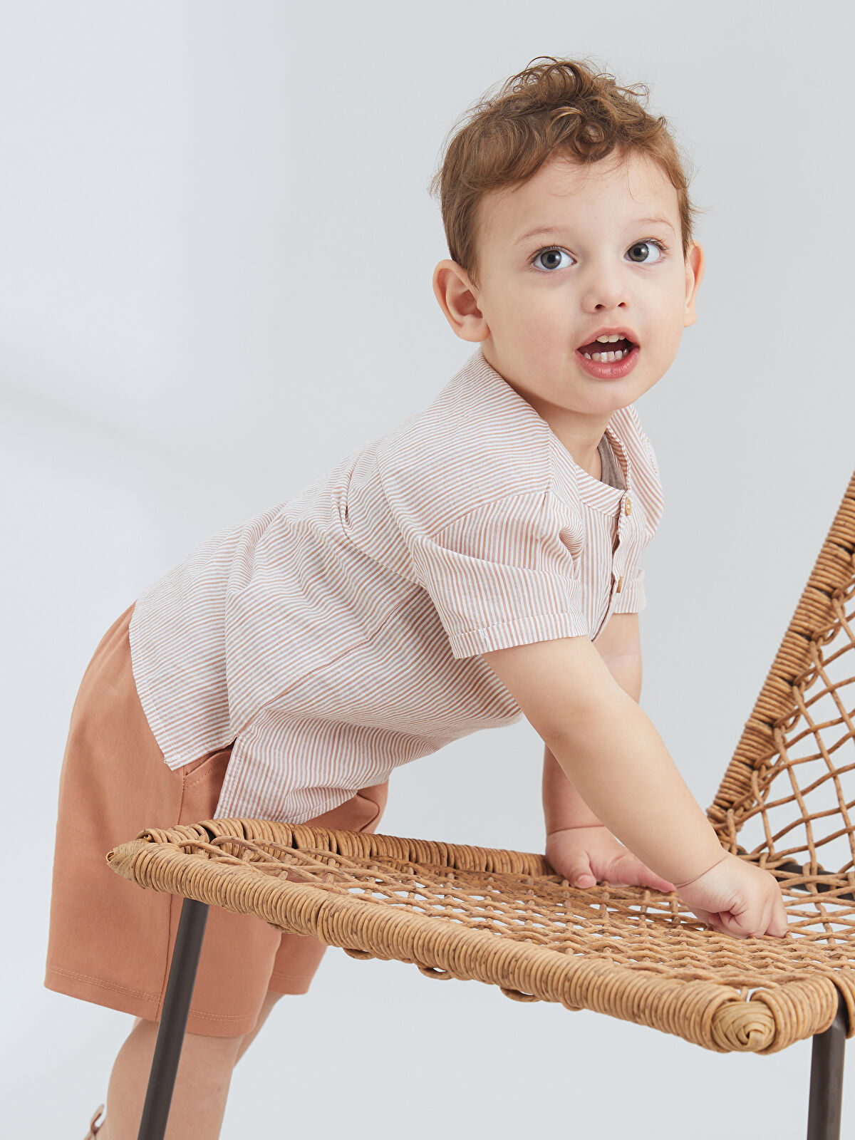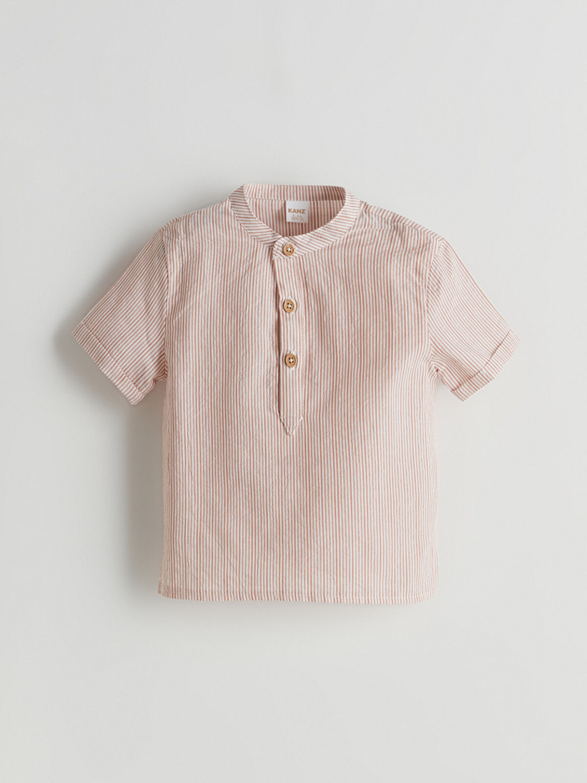 Dress your little one in style with this adorable KANZ ecru striped shirt and shorts set, perfect for any occasion. Made from 100% cotton, the short-sleeved shirt features a charming mandarin collar and a half-button closure, while the shorts are designed with an elastic waistband for a comfortable fit. This delightful outfit is ideal for keeping your baby boy cool and fashionable, making it a must-have for his wardrobe.