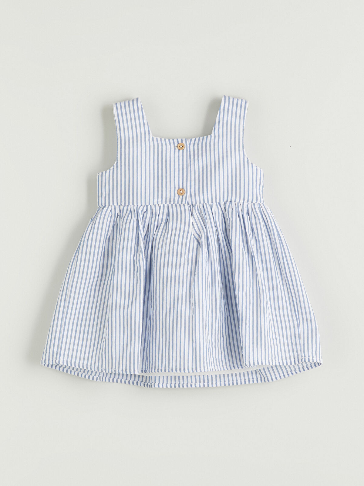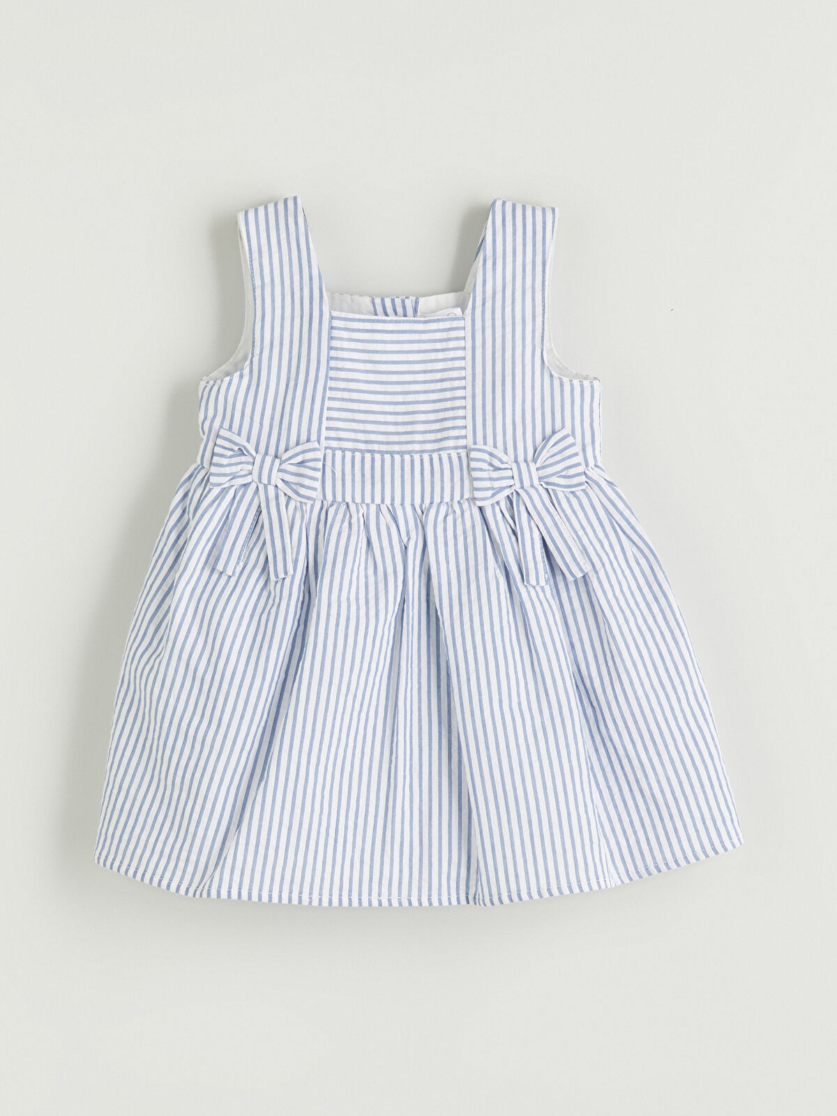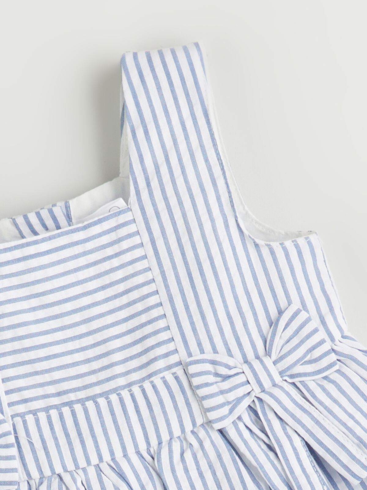 This charming sleeveless dress for baby girls features a square neckline and a delightful striped pattern, crafted from 100% cotton for ultimate comfort. The waist is adorned with lovely bow details, while the gathered skirt adds a playful touch, perfect for any occasion. Dress your little one in style with this adorable and breathable outfit that’s sure to keep her looking cute and feeling great all day long!