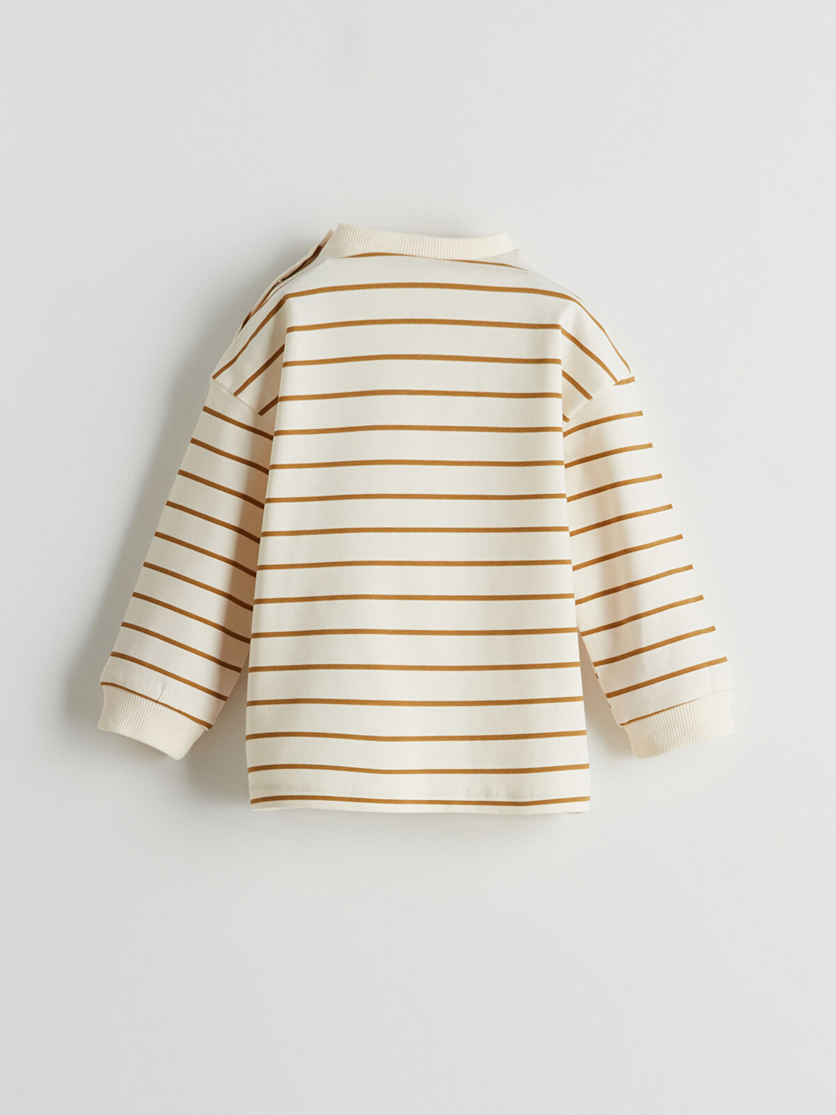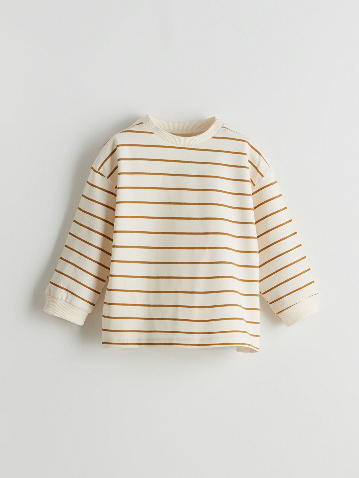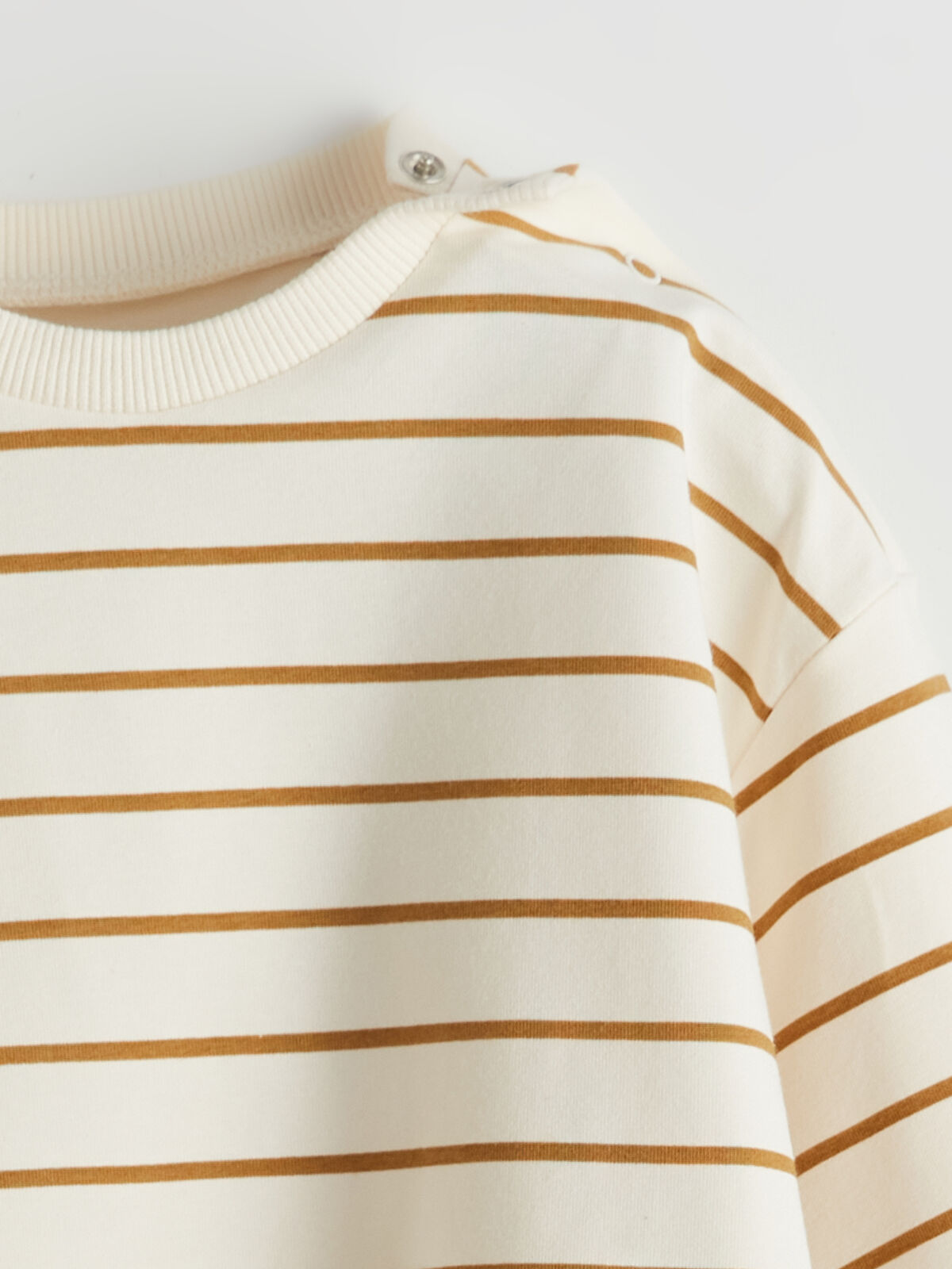 Dress your little one in style with this delightful cream-striped crew neck shirt for baby boys. Crafted from a soft blend of 96% cotton and 4% elastane, this long-sleeved tee ensures comfort and flexibility for all-day play. The ribbed cuffs and hem add a touch of stylish detail, making it a perfect addition to any casual outfit. Ideal for layering or wearing on its own, this shirt is a must-have for every baby boy’s wardrobe.