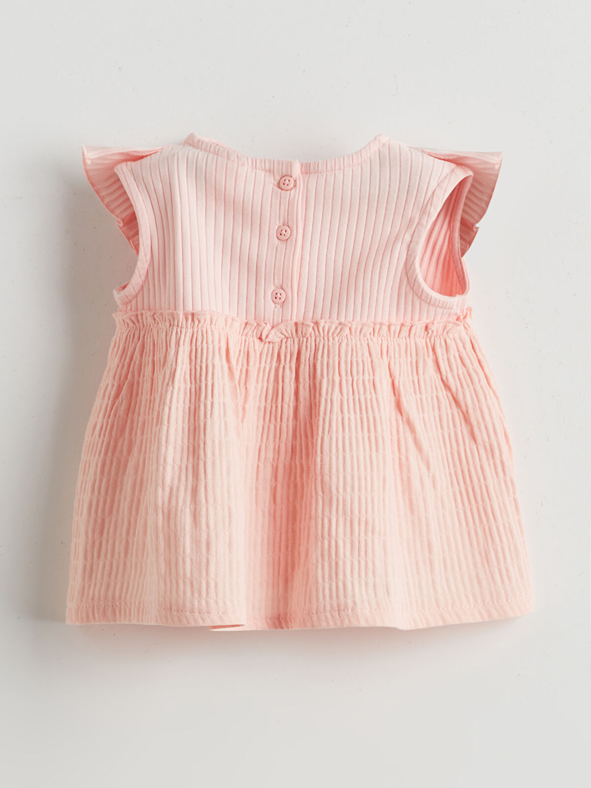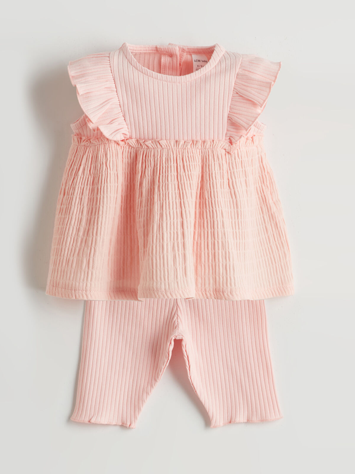 This adorable two-piece set for baby girls features a soft, high-cotton ribbed fabric that ensures comfort and style. The sleeveless blouse has a charming bicycle neckline and ruffled shoulders, complemented by a stylish button closure at the back. Paired with matching leggings that have an elastic waistband for a snug fit, this outfit is perfect for any occasion, making your little one look cute and feel cozy. Ideal for playdates or family gatherings, this set is a must-have addition to your baby’s wardrobe.