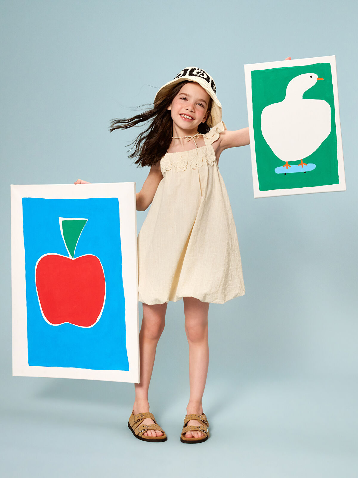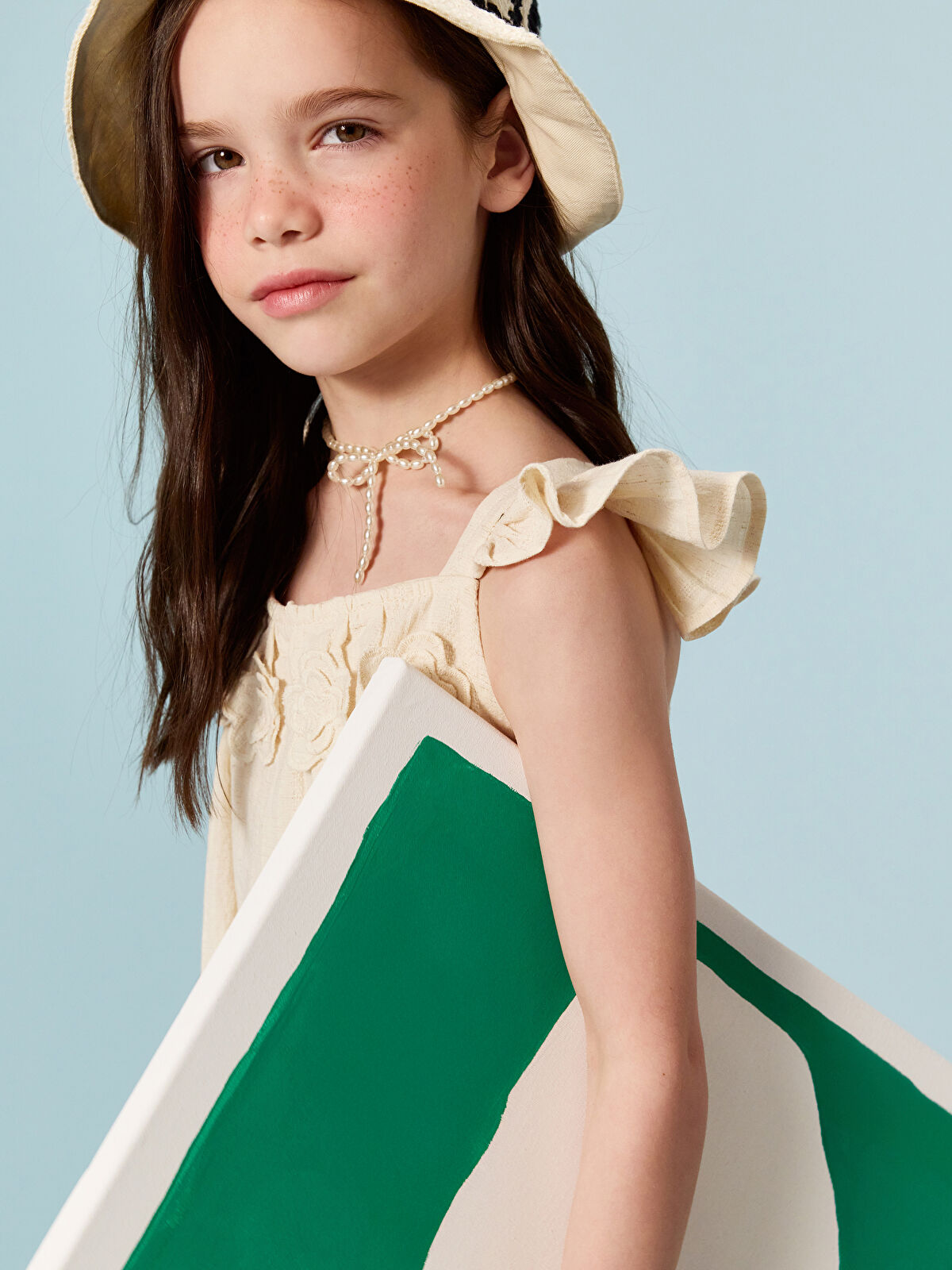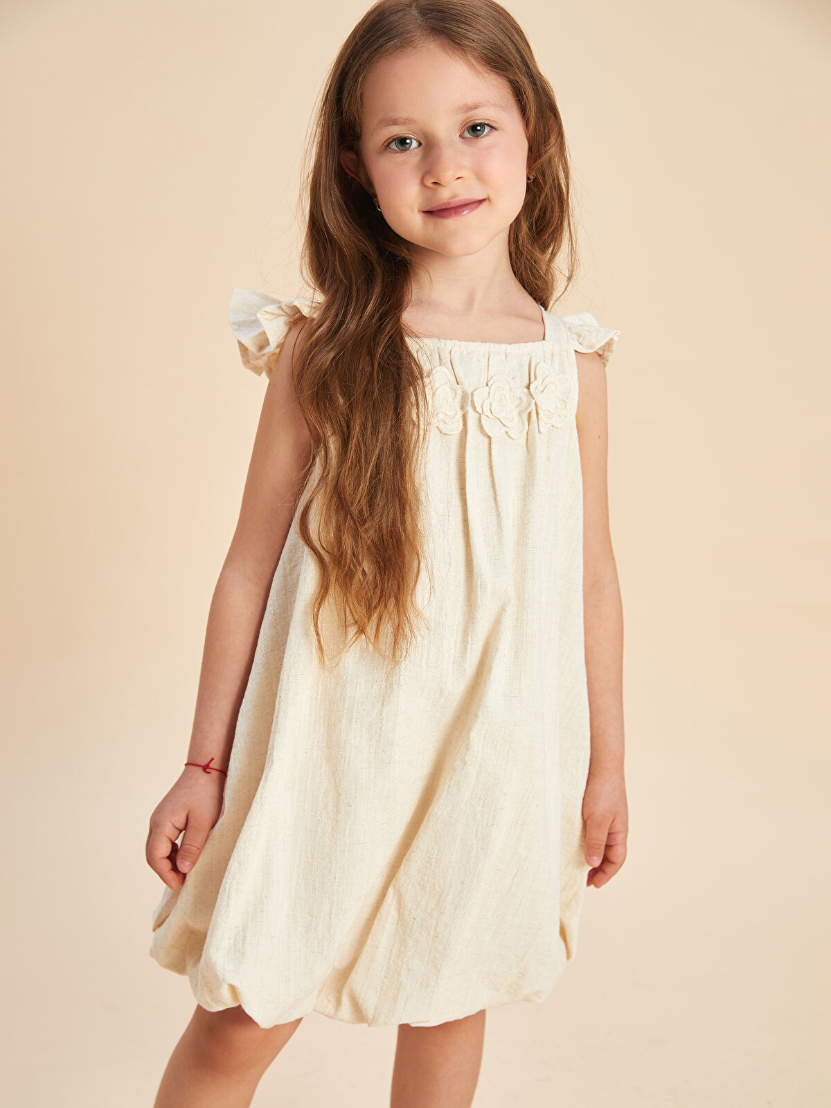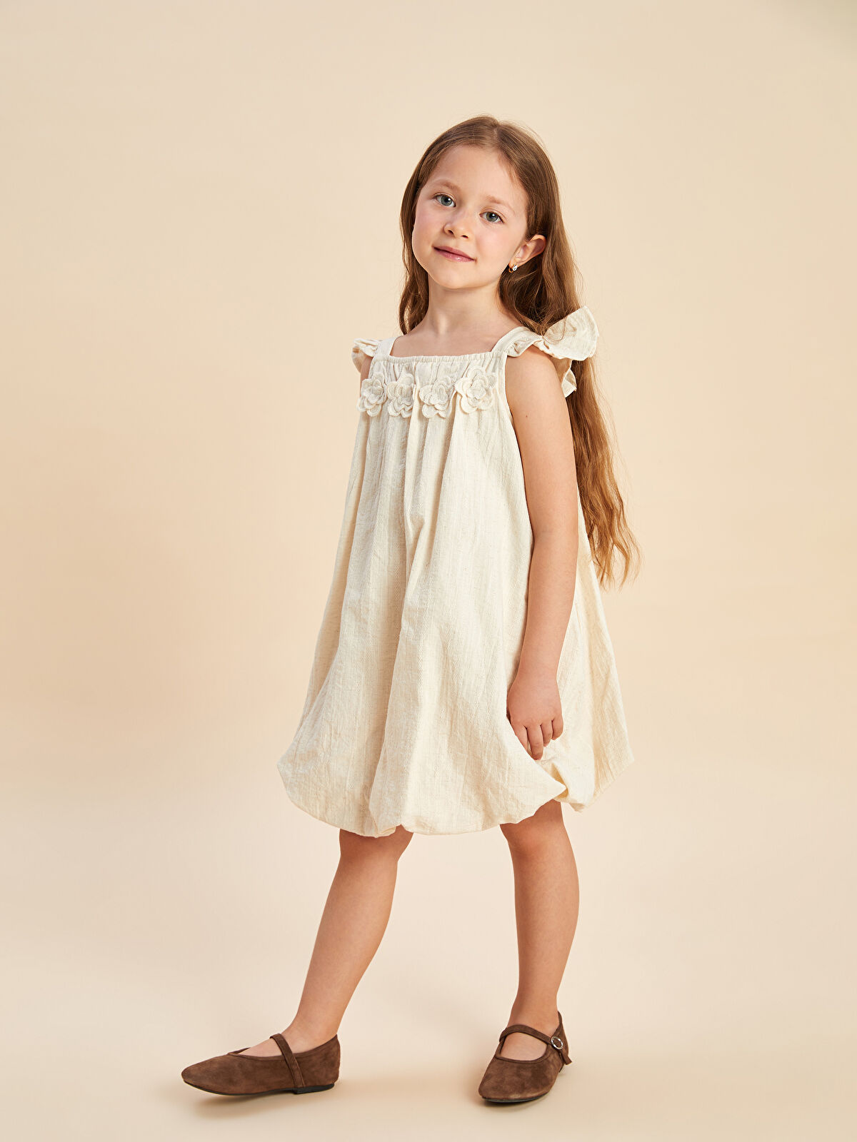 This charming beige dress for girls is crafted from a high cotton content and linen blend fabric, making it both comfortable and stylish. Featuring a square neckline and playful ruffled straps, it is adorned with a lovely floral applique at the collar. The gathered hem adds a touch of whimsy, perfect for everyday adventures or special occasions. Designed with a casual silhouette, this dress promises to keep your little one looking cute and feeling comfortable all day long.