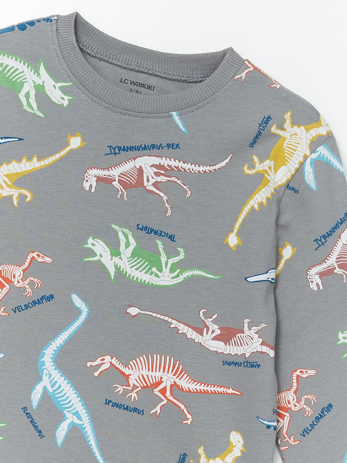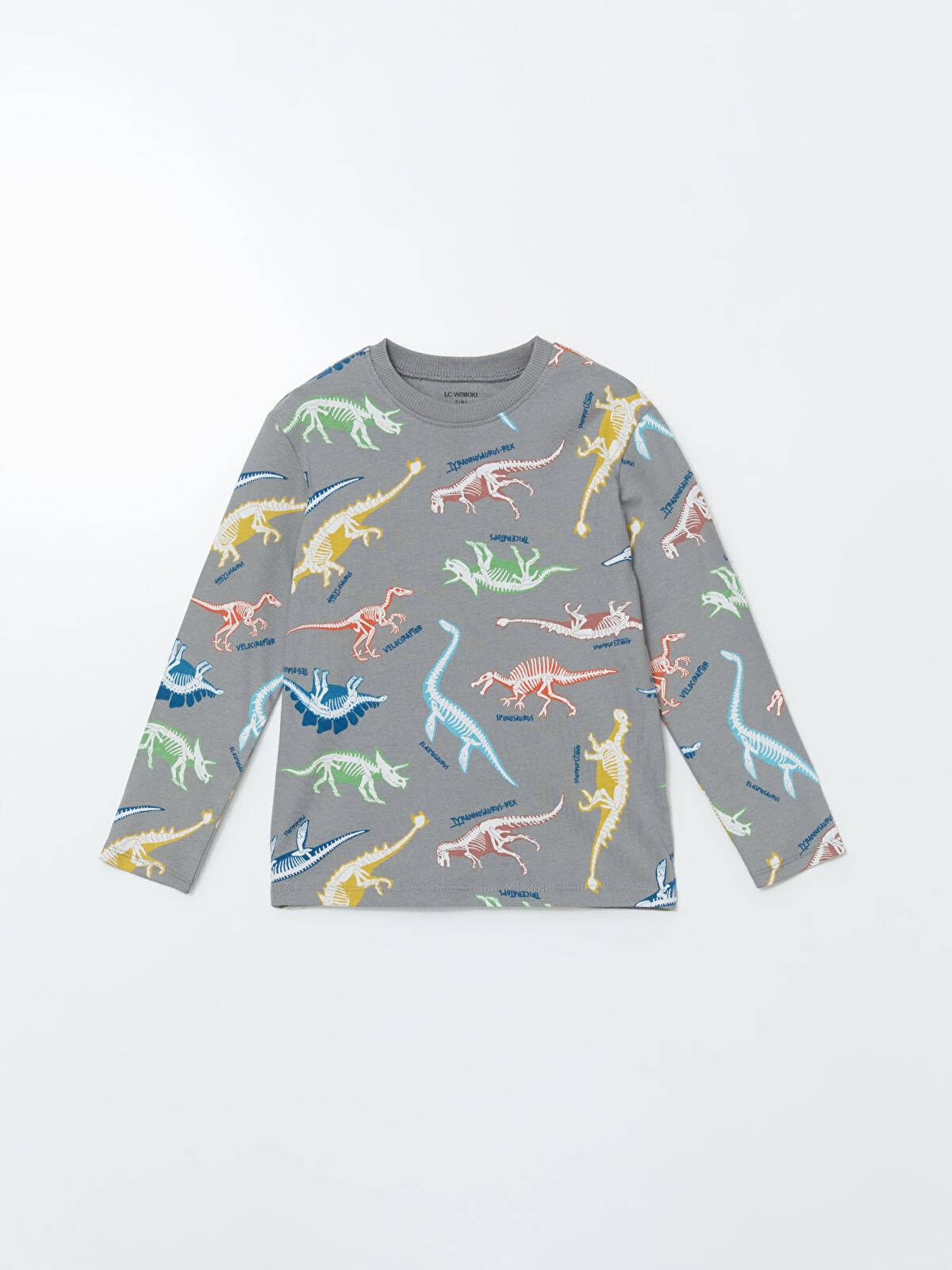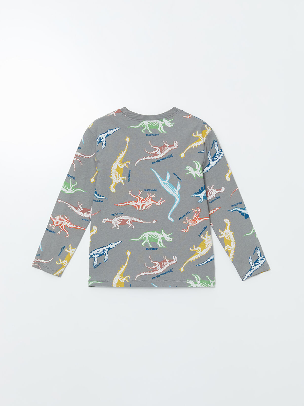 This stylish gray crew neck t-shirt for boys features a fun dinosaur skeleton print, perfect for little adventurers. Made from 100% soft cotton, it ensures comfort and breathability for all-day play. With long sleeves and a regular fit, this t-shirt is ideal for layering or wearing on its own. Let your child showcase their love for dinosaurs while enjoying the softness and durability of this essential wardrobe piece.