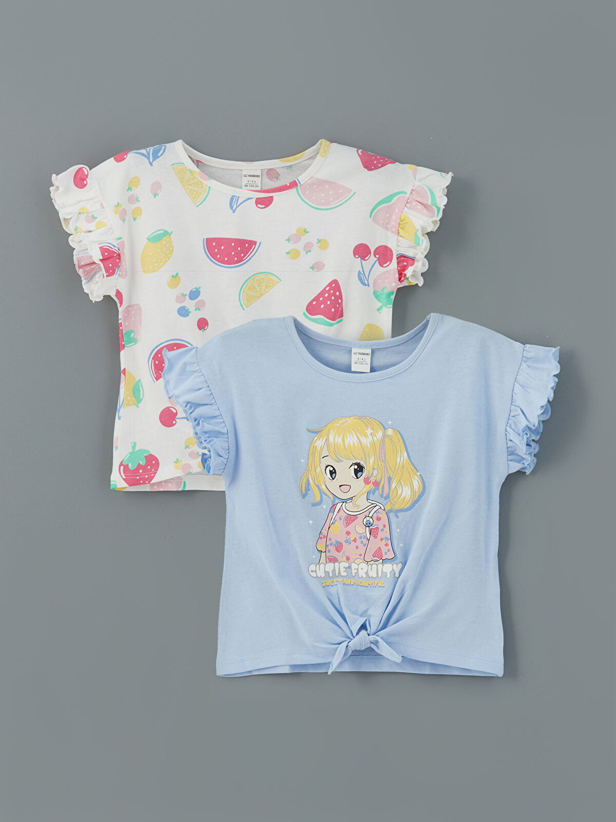 Delight your little one with this charming two-piece t-shirt set crafted from 100% cotton jersey. Featuring a classic crew neck, the set includes one short-sleeve t-shirt adorned with playful patterns and another with a stylish print and a cute tie detail at the front. Perfect for warm days, these soft and breathable tees are not only comfortable but also effortlessly stylish, making them a must-have addition to your girl’s wardrobe.