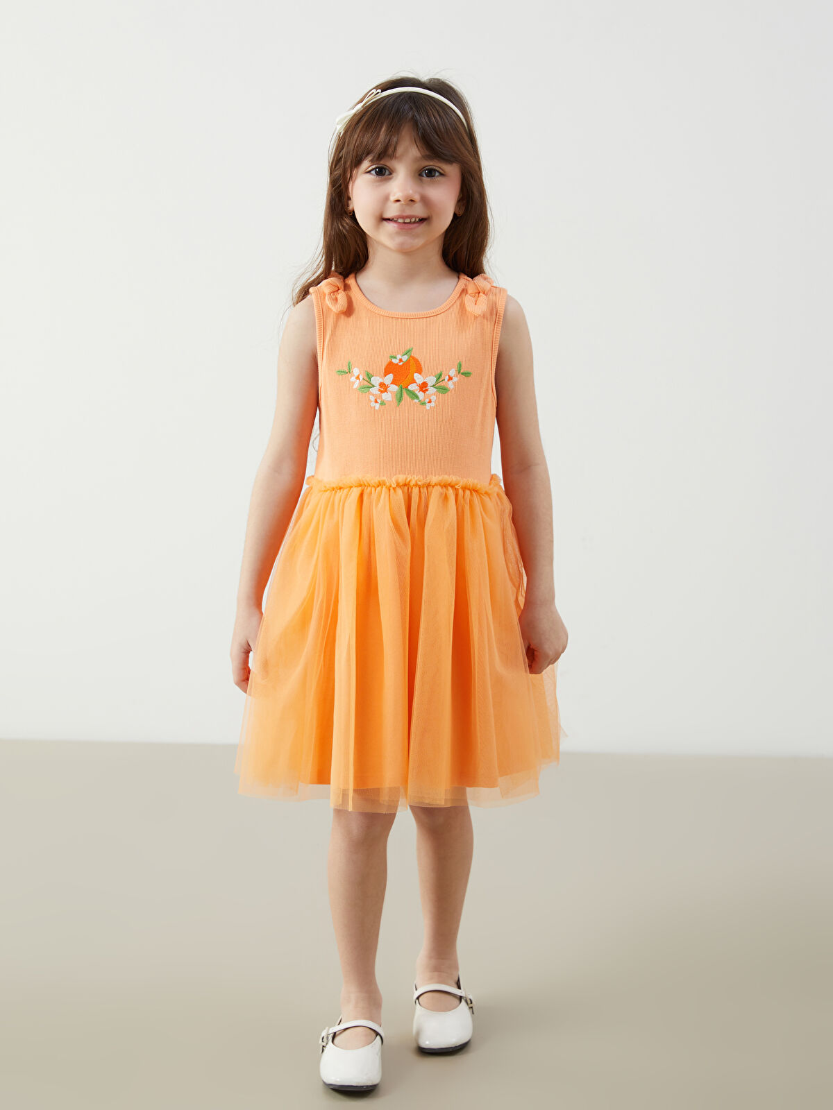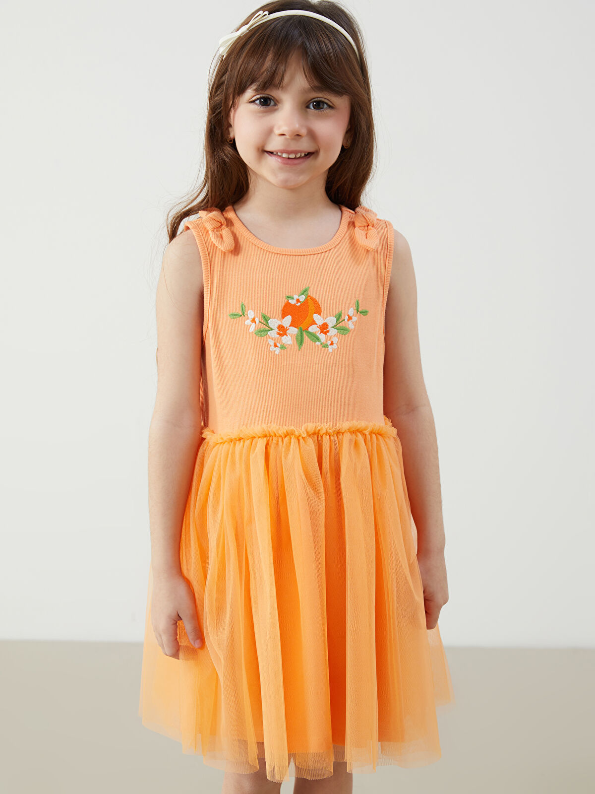 This delightful orange dress for girls features a charming floral design, perfect for sunny days and special occasions. Made from high-quality cotton-rich jersey fabric, it boasts a comfortable round neckline and sleeveless style, adorned with cute bow details on the shoulders. The dress includes a beautifully embroidered chest, a gathered waist for a flattering fit, and a lovely tulle skirt that adds a touch of whimsy. Ideal for birthdays or playdates, this stylish dress combines comfort and elegance, making it a must-have in your little one’s wardrobe.