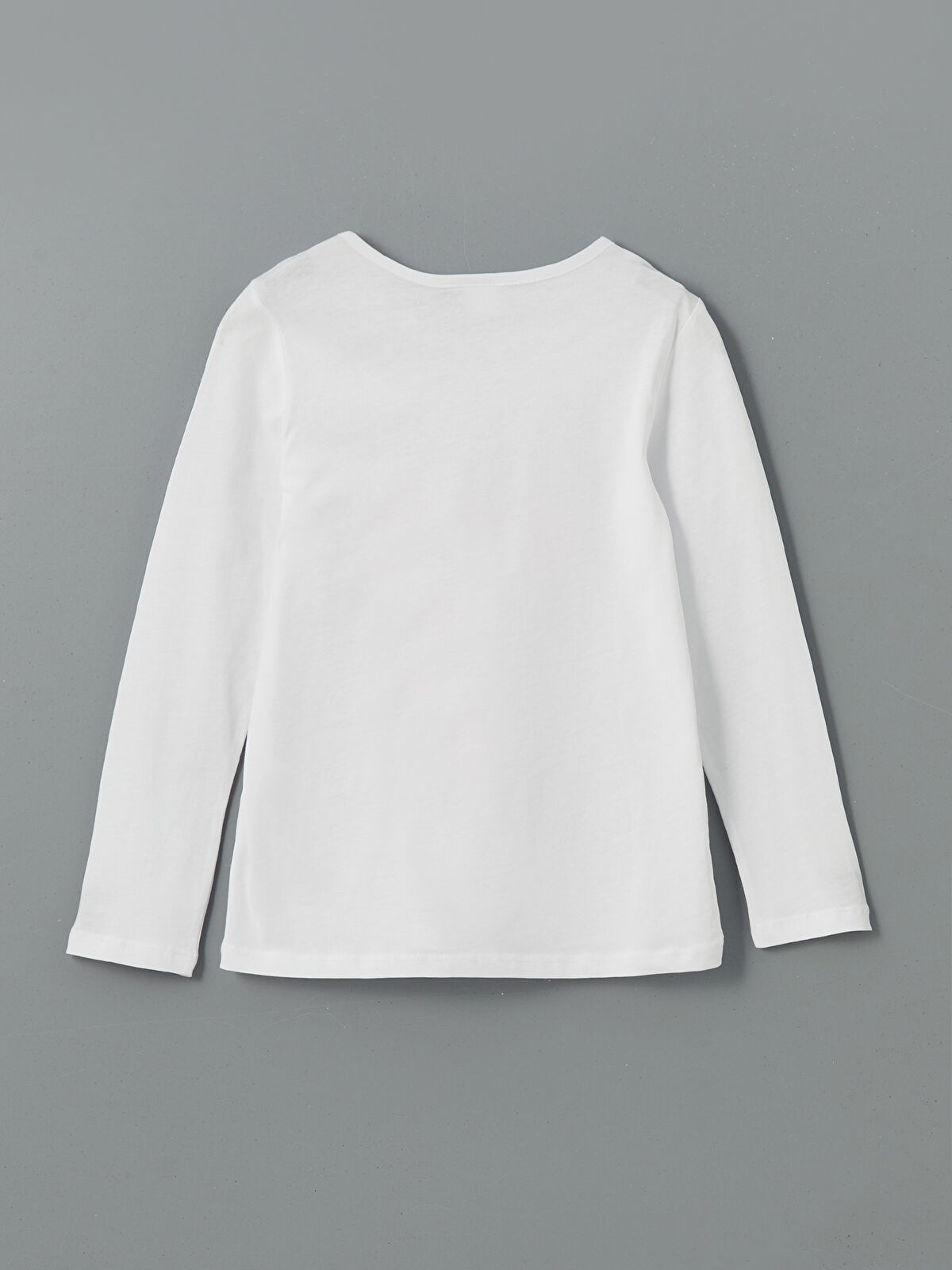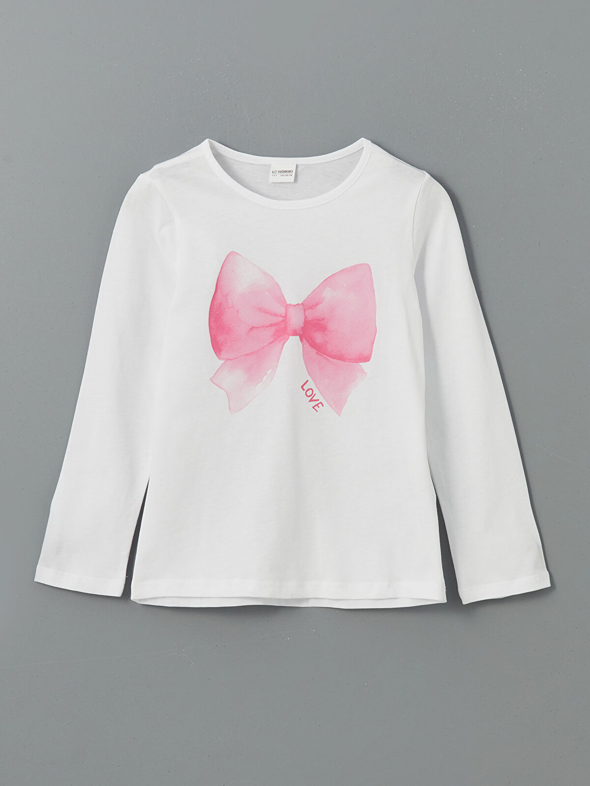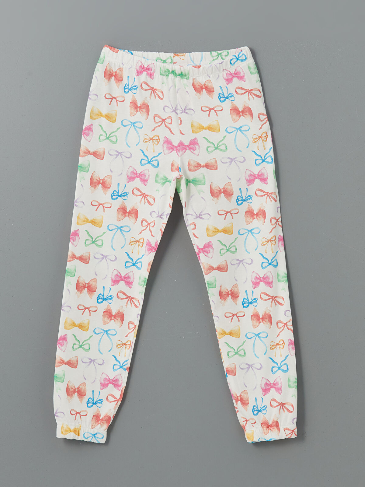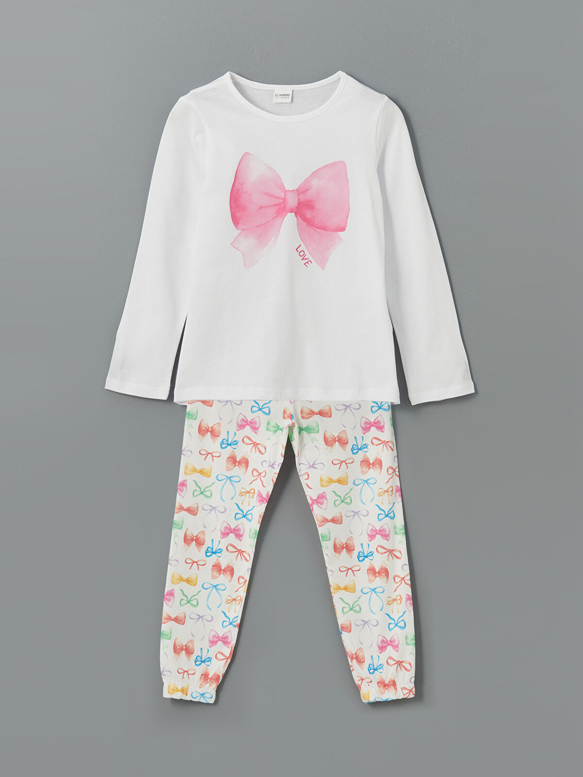 LCW Kids White Round Neck Bow Printed Girls Pajama Set