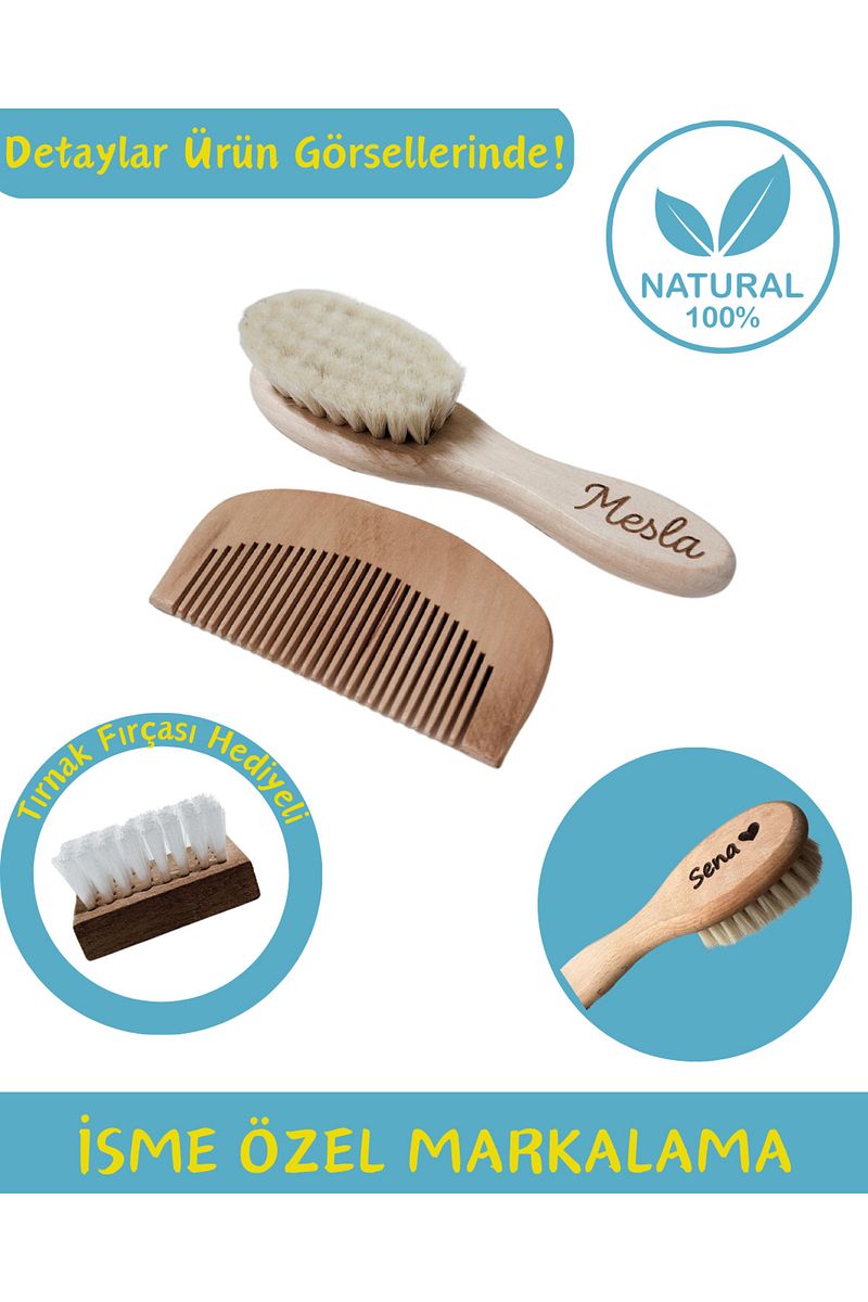 Mesla Organic Personalized Natural Goat Hair Soft Baby Comb and Wooden Comb Set - Midi Size
