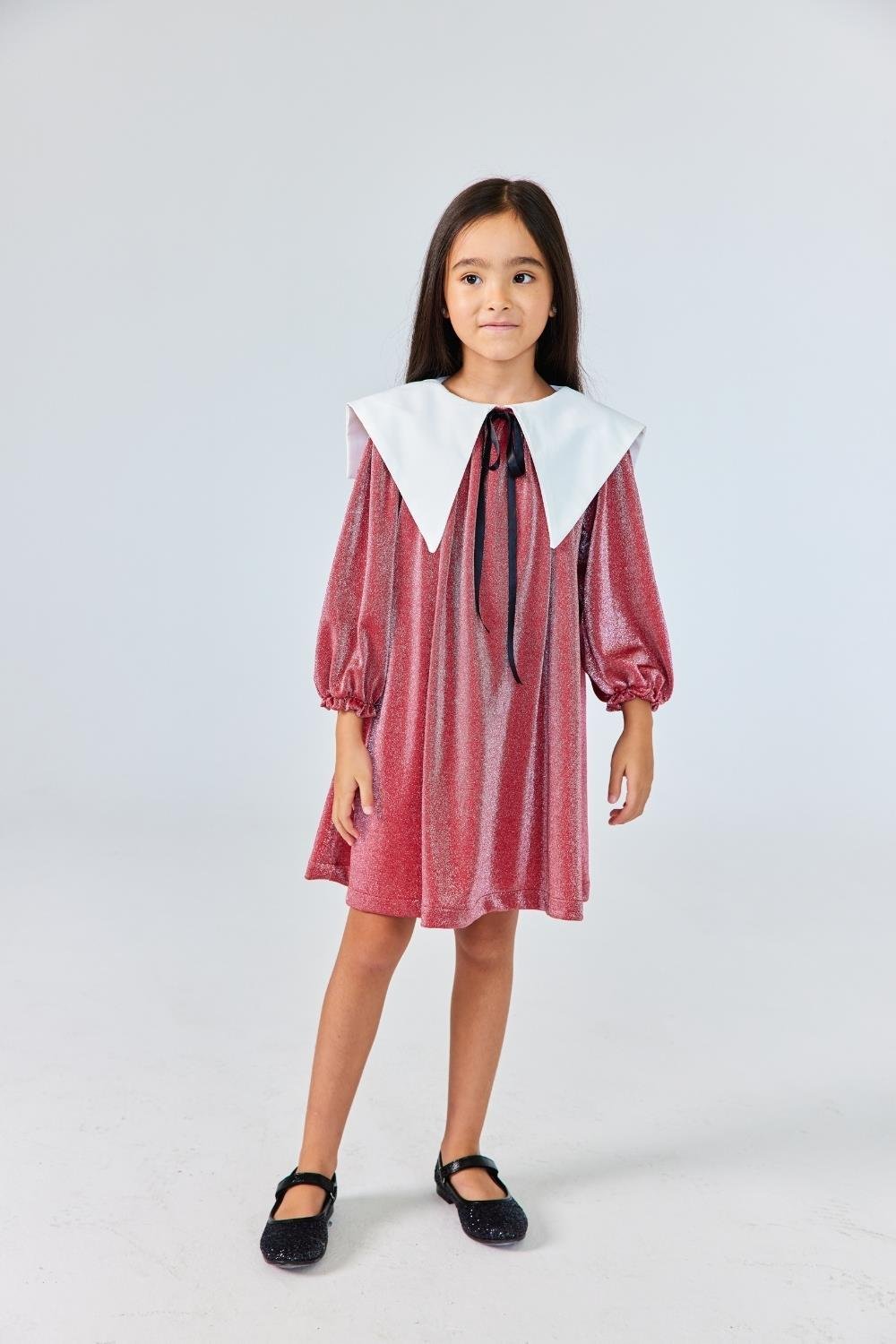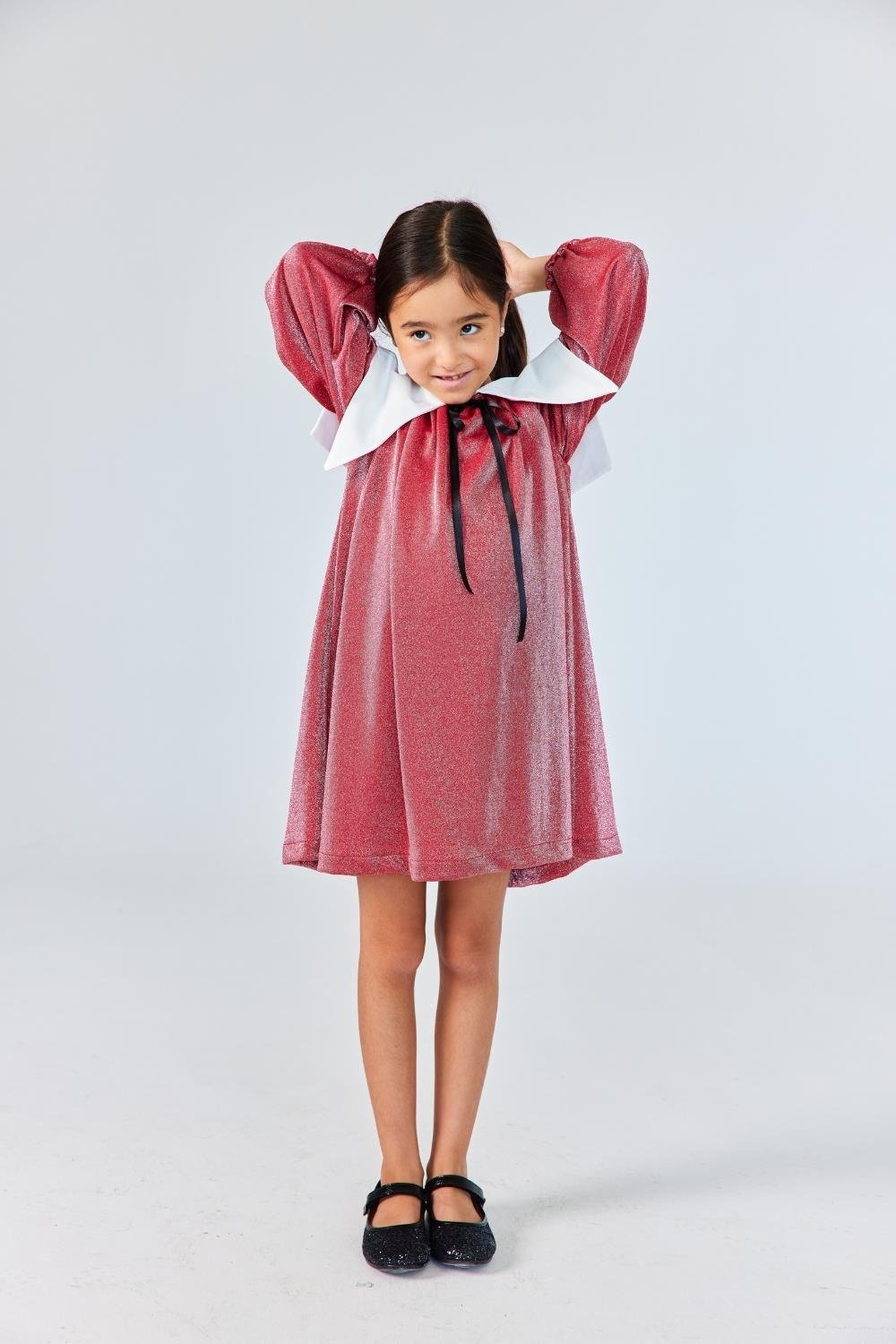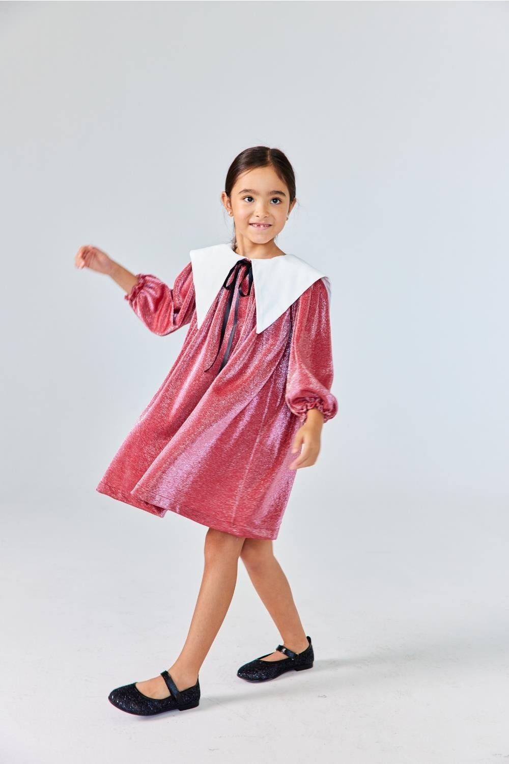 Designed especially for little ones, this charming dress features a shimmering knit fabric and a stylish pointed collar, creating an elegant look perfect for any occasion. Made from 100% polyester, the lightweight and subtly shiny material stands out beautifully, while the 100% cotton lining ensures comfort for your child. Whether for special celebrations or everyday wear, this dress is an ideal choice that combines style and comfort effortlessly.