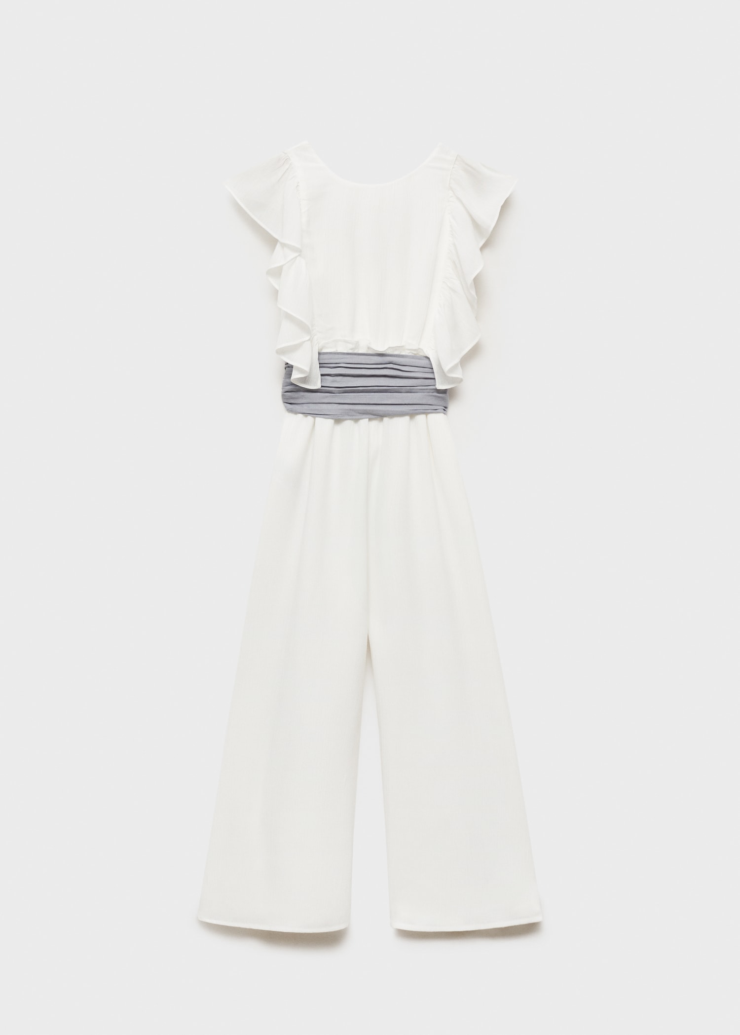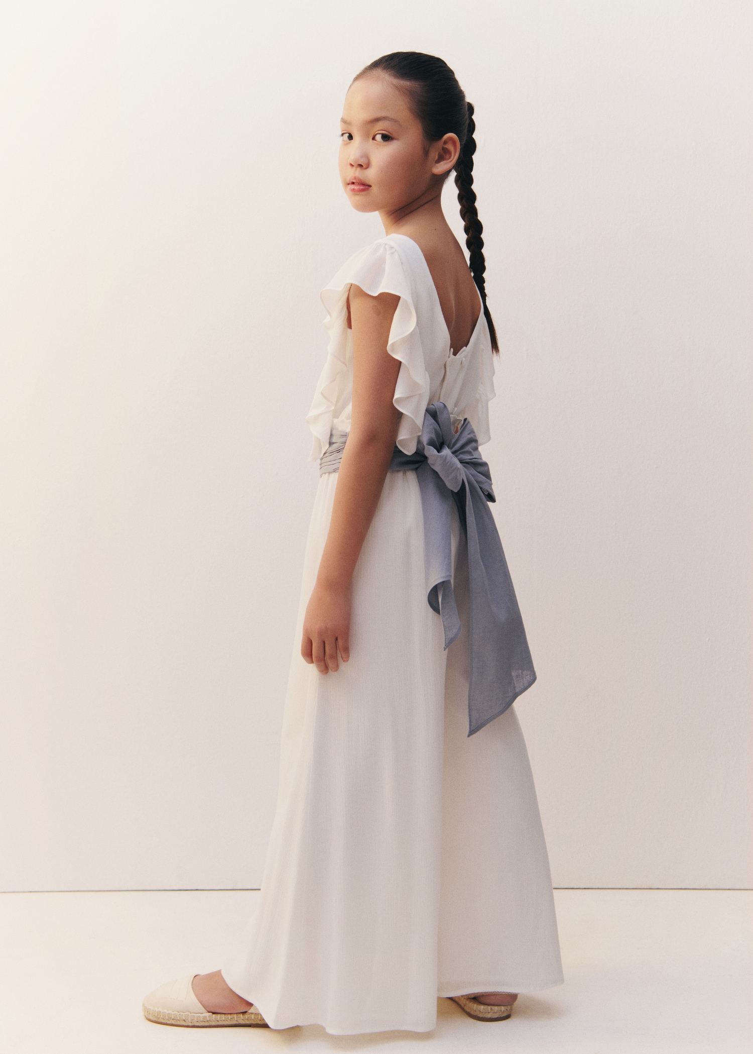 This charming ruffled long jumpsuit is perfect for your little one’s special occasions and events. Made from a soft, bamboo-like fabric, it features a textured finish and a stylish long design with a round neckline. The delightful ruffled sleeves and pleated waistband add a playful touch, while the back cutout and button closure ensure easy wear. Fully lined with 100% cotton for comfort, this jumpsuit is a must-have for any stylish child’s wardrobe.