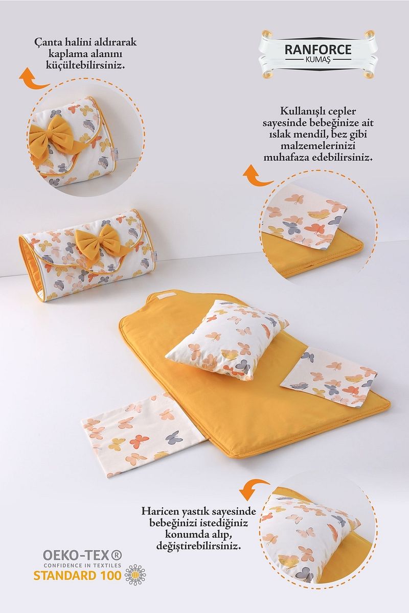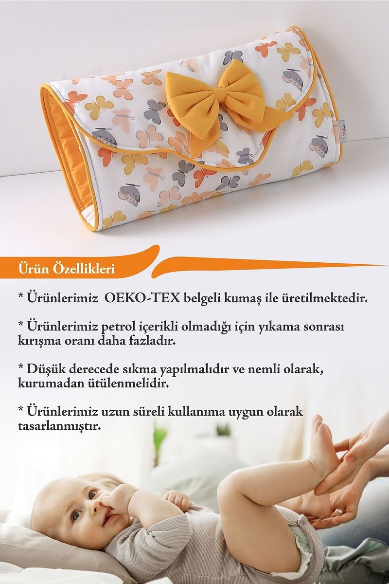Introducing the Umaybebek Changing Mat in a delightful mustard butterfly design, perfect for on-the-go parents. This portable changing mat comes with a convenient carrying bag, making diaper changes anywhere a breeze. Crafted with soft, durable materials, it ensures comfort for your little one while keeping messes contained. Ideal for stylish outings, this changing mat combines functionality with a playful touch, making it a must-have for every nursery.