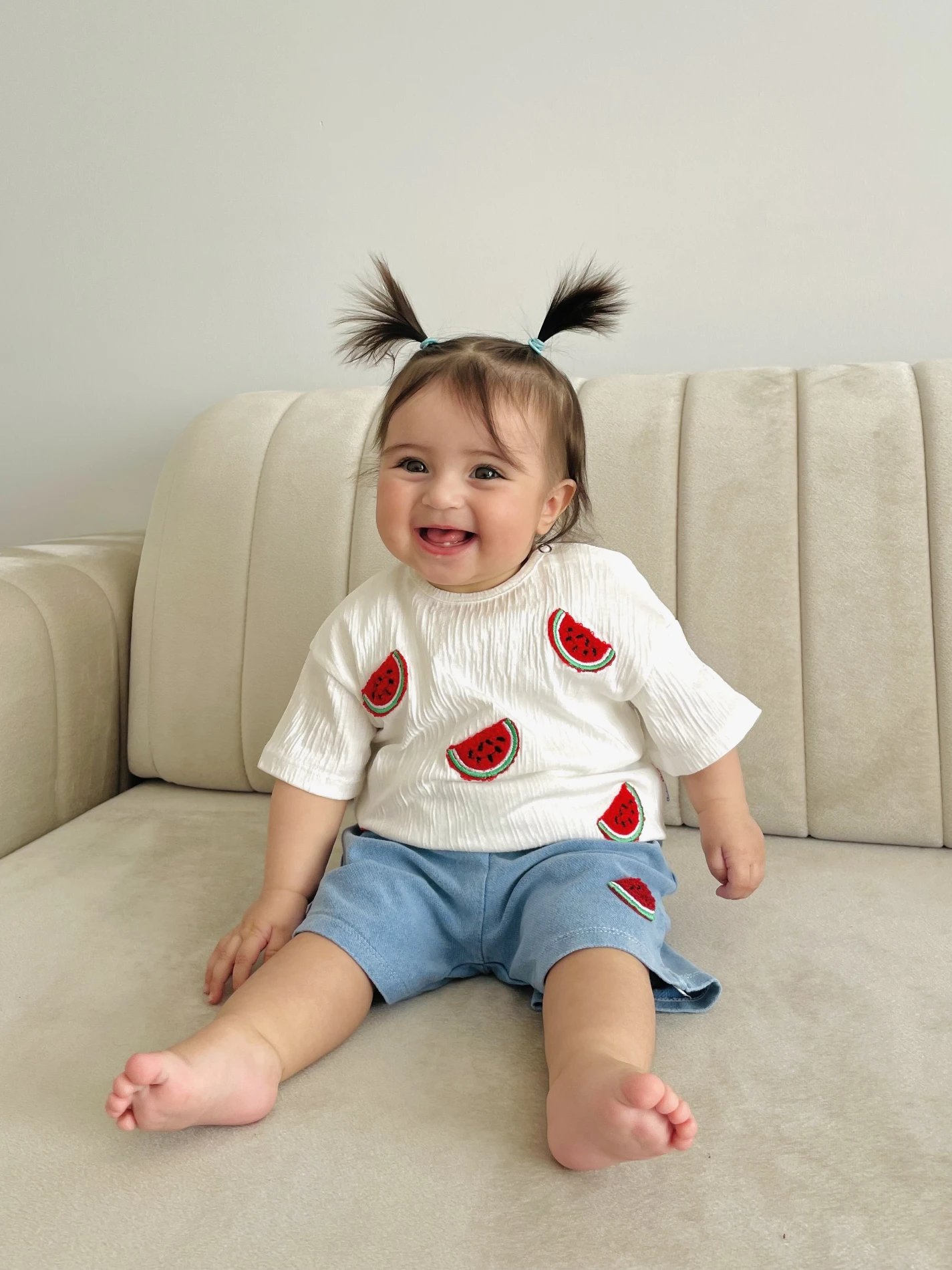 Dress your little one in this adorable Watermelon Embroidered Ruffled Fabric T-Shirt Set, crafted from 100% cotton with added stretch for comfort and flexibility. Perfect for playdates or casual outings, this two-piece set combines fun design with soft, breathable fabric, making it an ideal choice for keeping your child stylish and comfortable all day long.