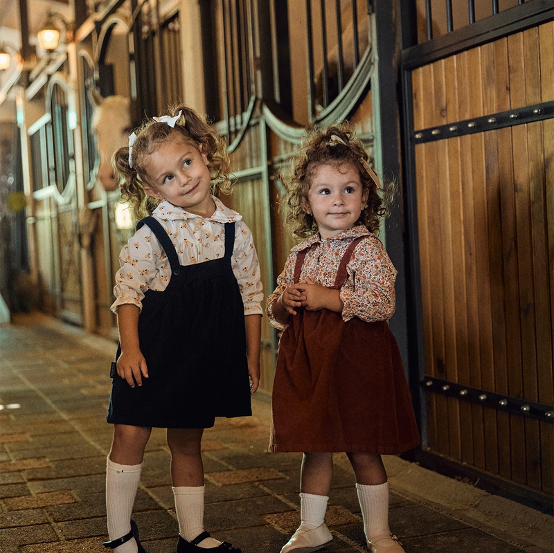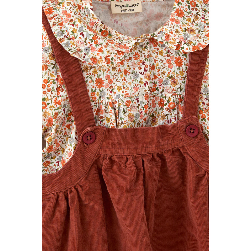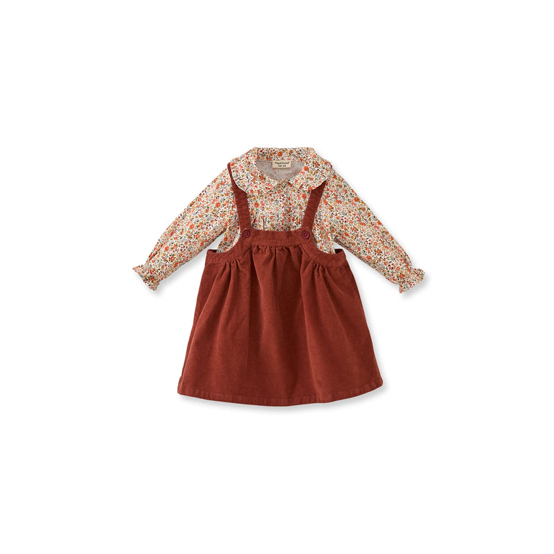 This charming two-piece set features a long-sleeved shirt with delightful ruffle details and a button-down front, perfectly paired with a soft velvet dress. The dress showcases a classic design with a straight neckline and adjustable button straps, while both pieces are adorned with lovely pleat details for a stylish touch. Made from 100% cotton, this outfit is not only fashionable but also comfortable for your little one. Ideal for any occasion, it’s easy to care for with a gentle wash and low-heat ironing, making it a practical choice for busy parents.