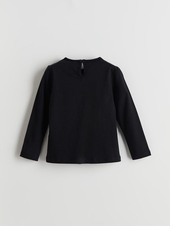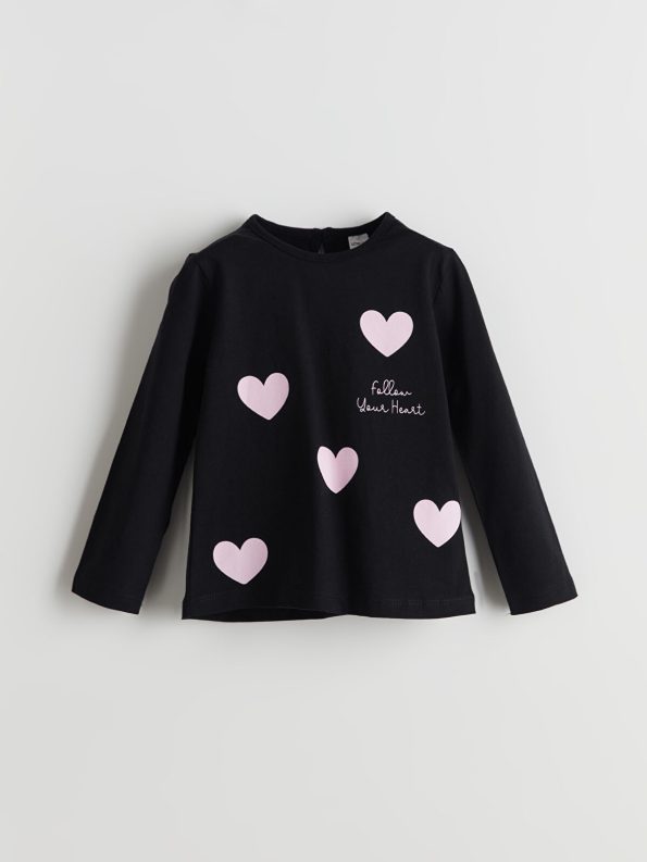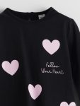 This charming black t-shirt for girls features a classic crew neck and long sleeves, crafted from 100% soft cotton for ultimate comfort. Adorned with a playful heart pattern and stylish embroidery, it adds a touch of fun to any outfit. The convenient button closure at the back ensures easy dressing, making it perfect for your little one’s everyday adventures.